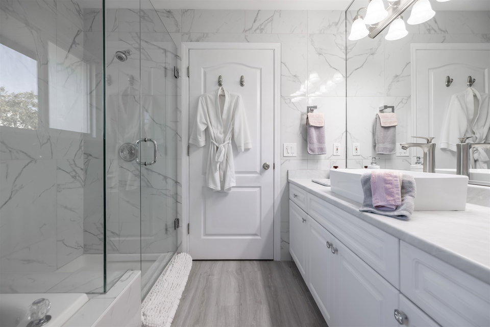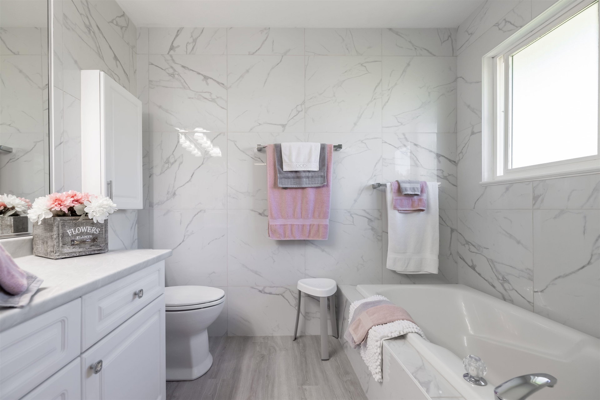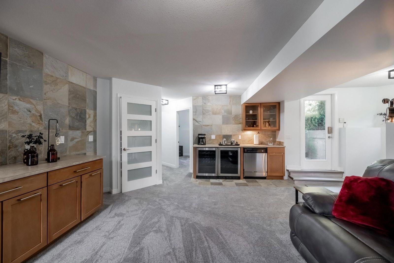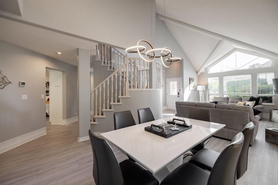 CLOVERDALE STUNNER! This renovated 3307 sq ft 3 level home is meticulous. Completely renovated 5 bedroom home with open, bright layout. Warm designer paint tones throughout. New floors, tile, upgraded lighting, built in cabinets, high efficient furnace & air conditioning! Stunning living area w vaulted ceilings & adjoining formal living area for entertaining. Bonus office on main floor. Incredible kitchen area w granite countertops, white shaker cabinetry, and stainless steel appliances. New high quality carpets throughout. 3 spacious bdrms upstairs & beautiful master suite w renovated ensuite. Huge glass shower. Separate entrance to bright basement is a great mortgage helper. 220v plug ready for stove & separate laundry. Breathtaking 7481 sq ft yard w multiple areas to entertain! WOW!