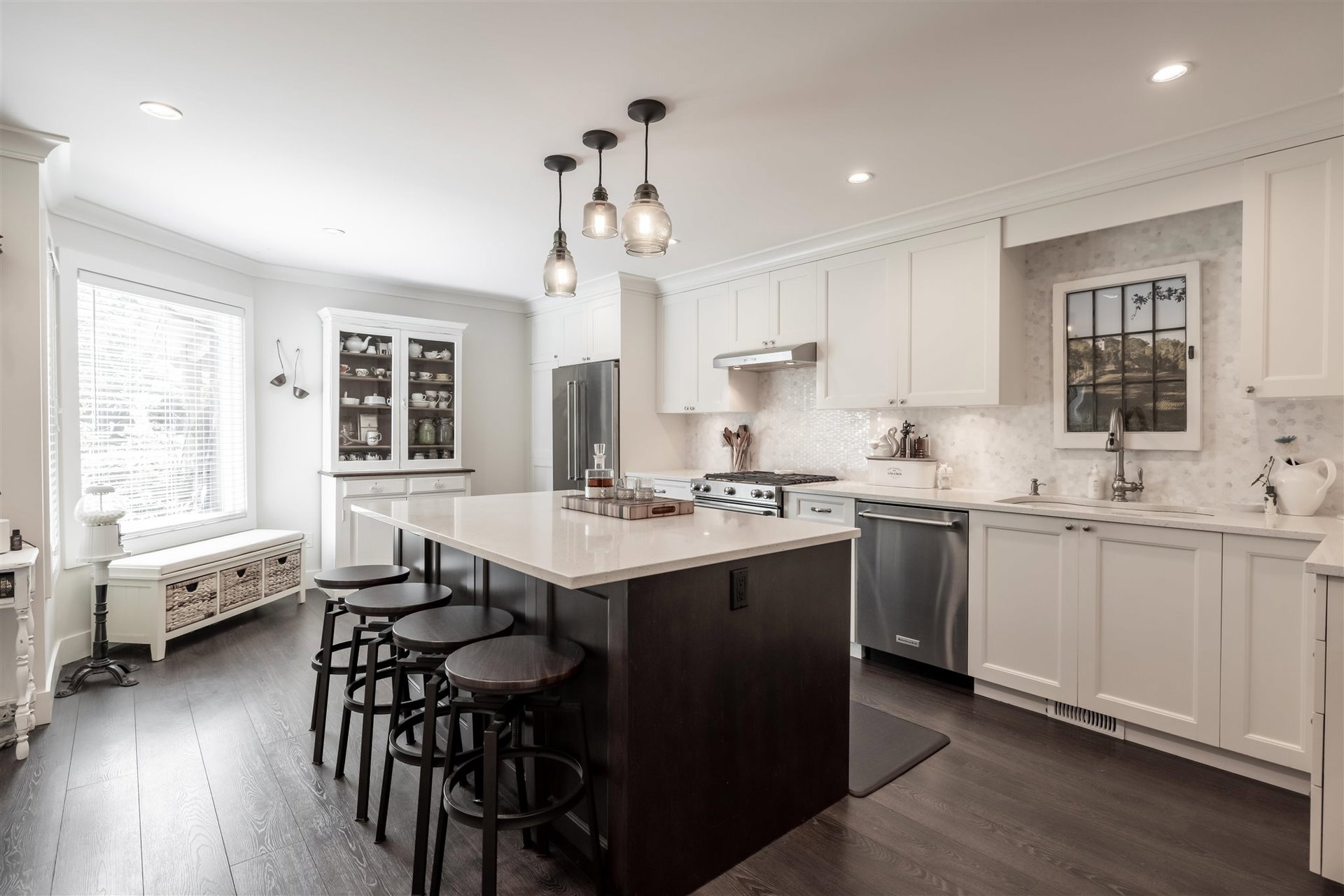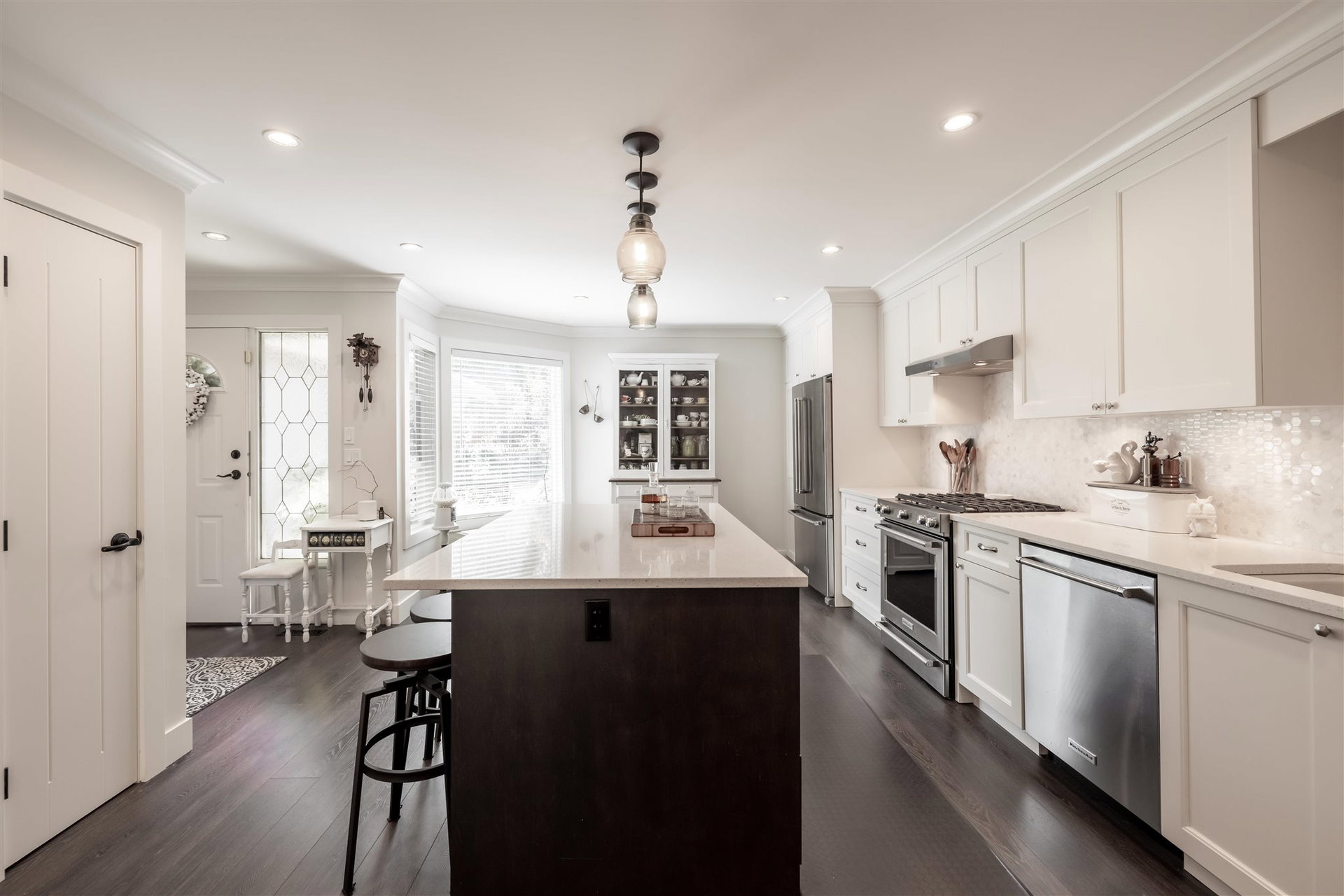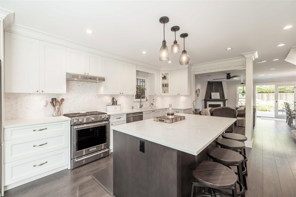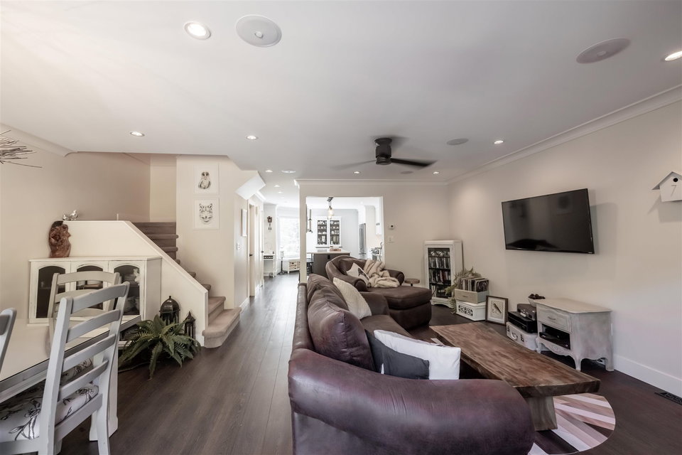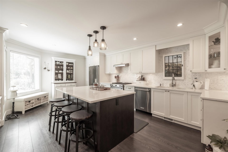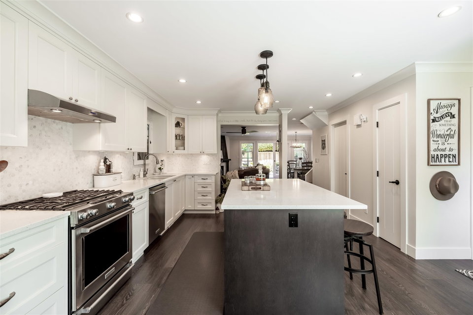 Highly sought after RIVER SHORES in South Steveston! This jaw dropping 3 bedroom townhome has be renovated TOP TO BOTTOM! No expense spared in this $150,000+ Reno featuring beautiful walnut floors, new windows, washrooms, lighting, warm paint tones and moldings throughout. Step inside to this gorgeous custom kitchen with open floor plan. New cabinets, quartz countertops, stainless steel appliances & gas range, large island for entertaining, beautiful backsplash, undermount sink & Kohler fixtures! Open concept into living area with gas fireplace, spacious dining area to entertain & sliding door leading to extended private patio area. A great spot for summer BBQ’s! Updated furnace & hot water tank. Stunning 3 bedrooms upstairs w incredible master suite. Footsteps to Steveston Village!