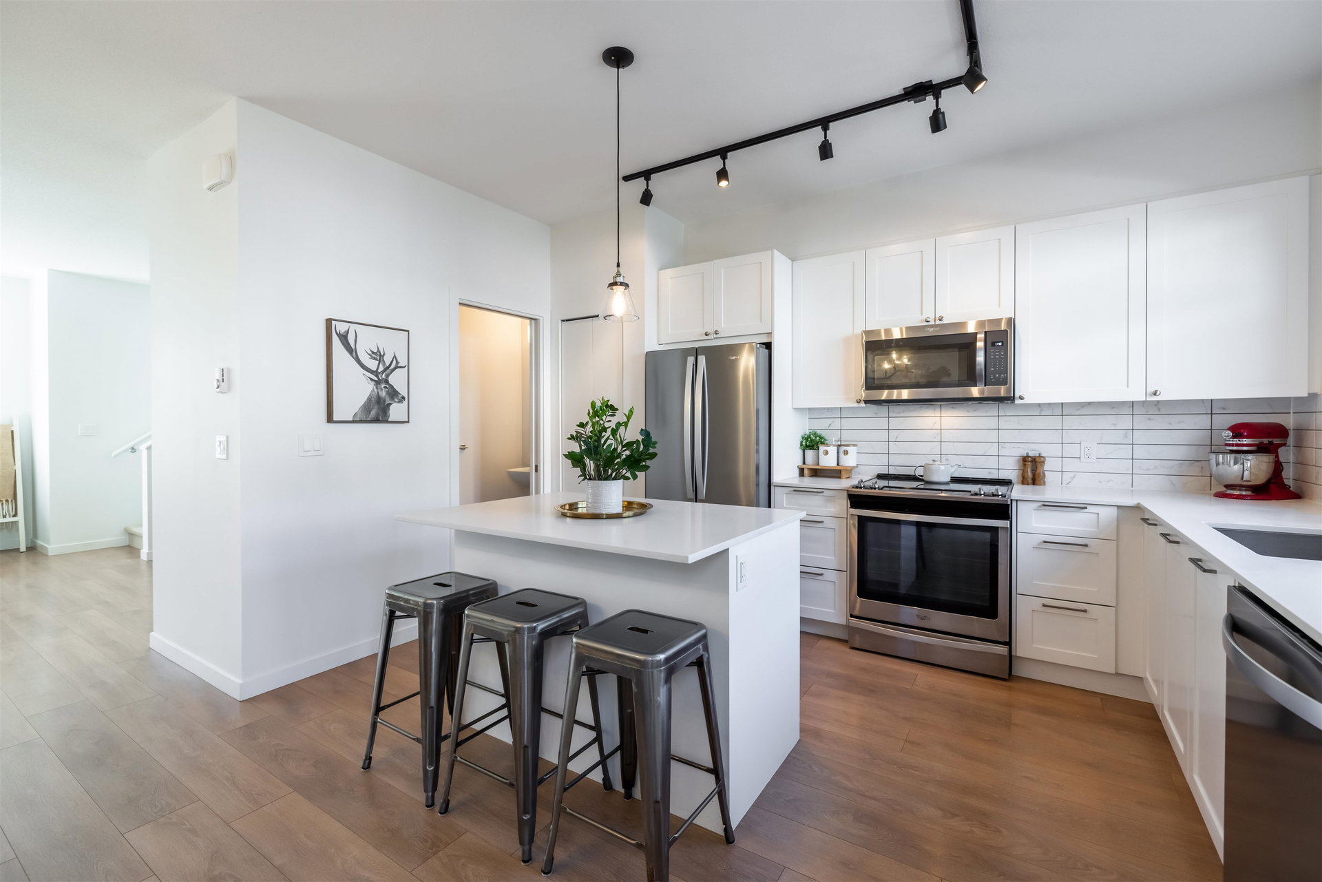 Welcome to CLAYTON WALK! Your search is over as this meticulous 3 bedroom plus Den (could be 4th bedroom) townhouse is a beauty! DOUBLE CAR side by side unit. This beautiful home has a great floor plan with open main floor, light oak floors, upgraded fixtures & a great spot to entertain. Oversized living space w large window overlooking back greenspace. White kitchen with island, stainless steel appliances & subway tile backsplash. Sliding door leads to huge deck for summer bbq’s & dinners outside. 3 bedrooms upstairs. Master suite has designer wall, double sinks in ensuite w oversized glass shower & walk in closet. Quality built development. Amenities Room has kitchen & Gym. Footsteps to Parks, Shopping & future sky train stop. Parking pad could fit smaller cars. 10 out of 10!