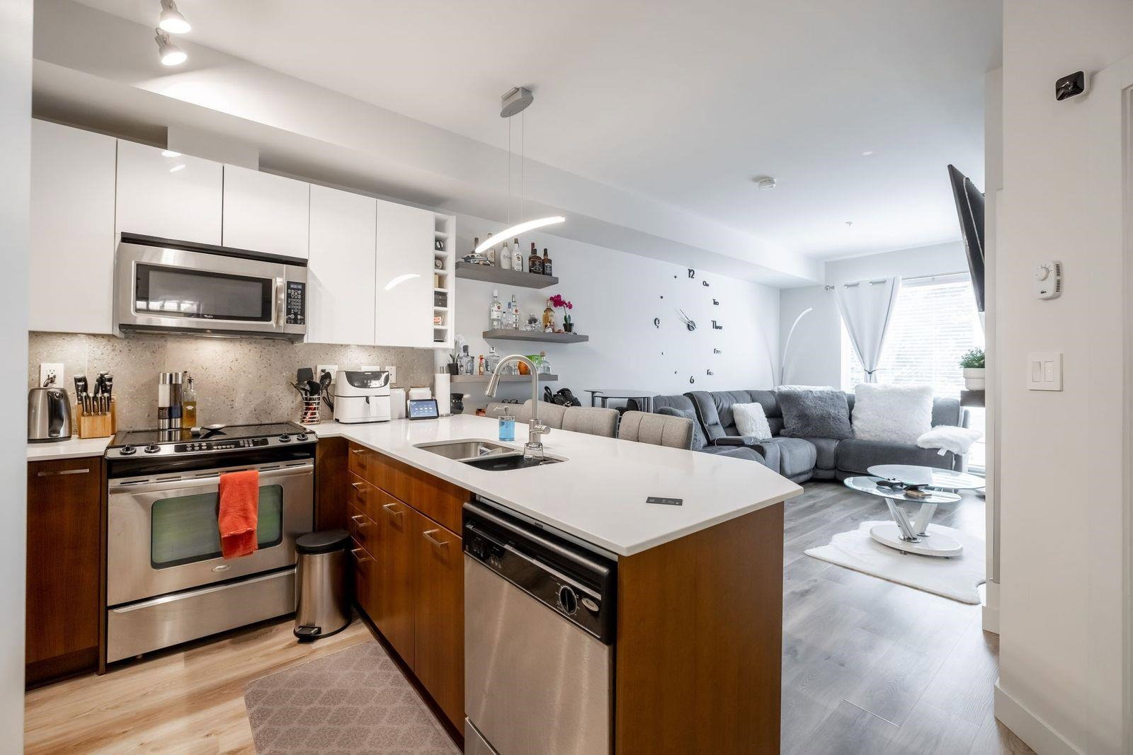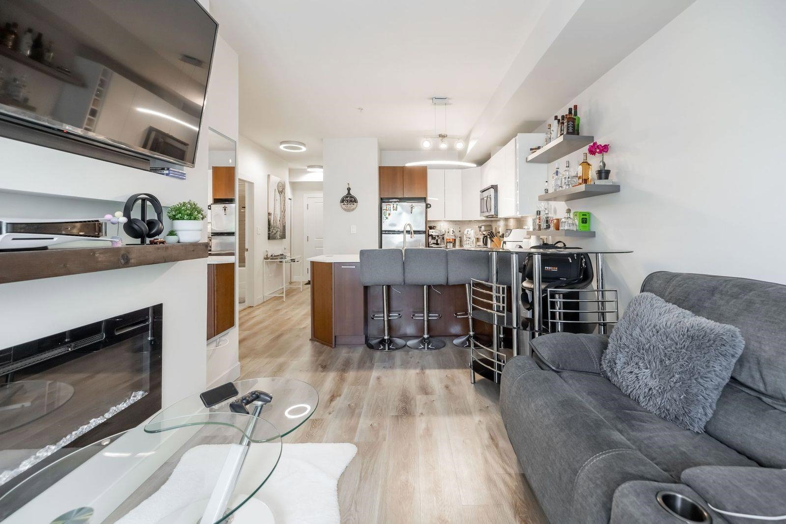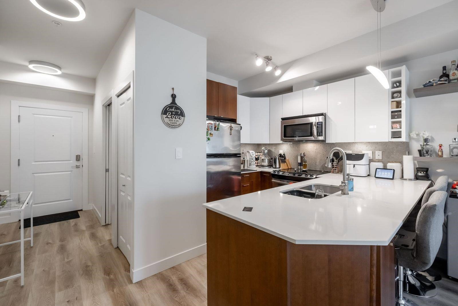 Beautifully updated 1 bedroom & Den unit facing SOUTH in The ELEMENT! Step inside to this bright unit w fresh warm paint tones, updated flooring, lighting fixtures & quartz countertops. Den could be a seceond bedroom. Updated washroom. Deck off living area is a great place to enjoy a morning coffee. This is a perfect opportunity to get your foot in the door in Surrey’s growing real estate market. This unit also offers 1 parking as well as 1 underground storage locker! Of course, one of the best features is your location, footsteps to shopping, transit, SFU Surrey and recreation, Call now for your personal tour!