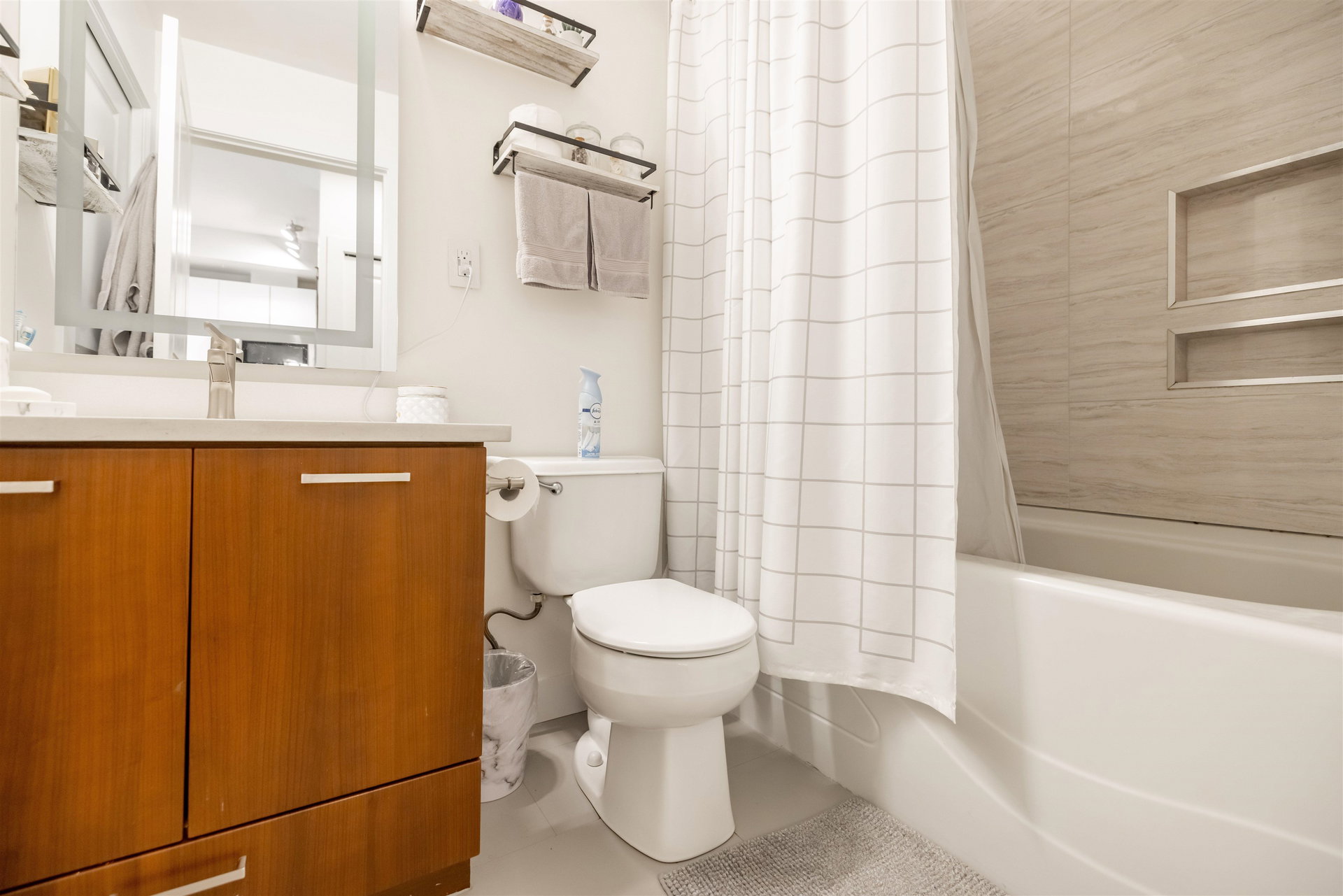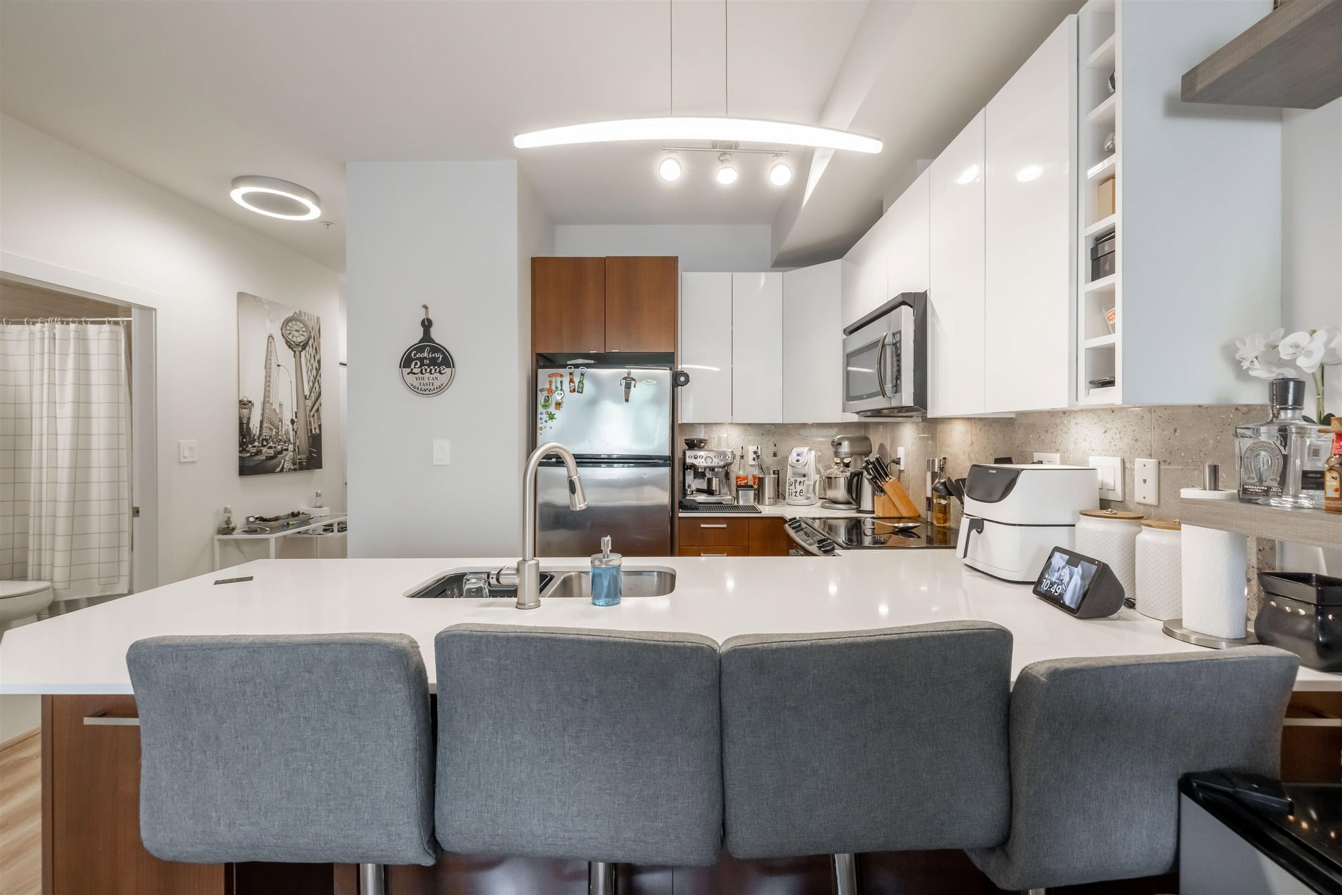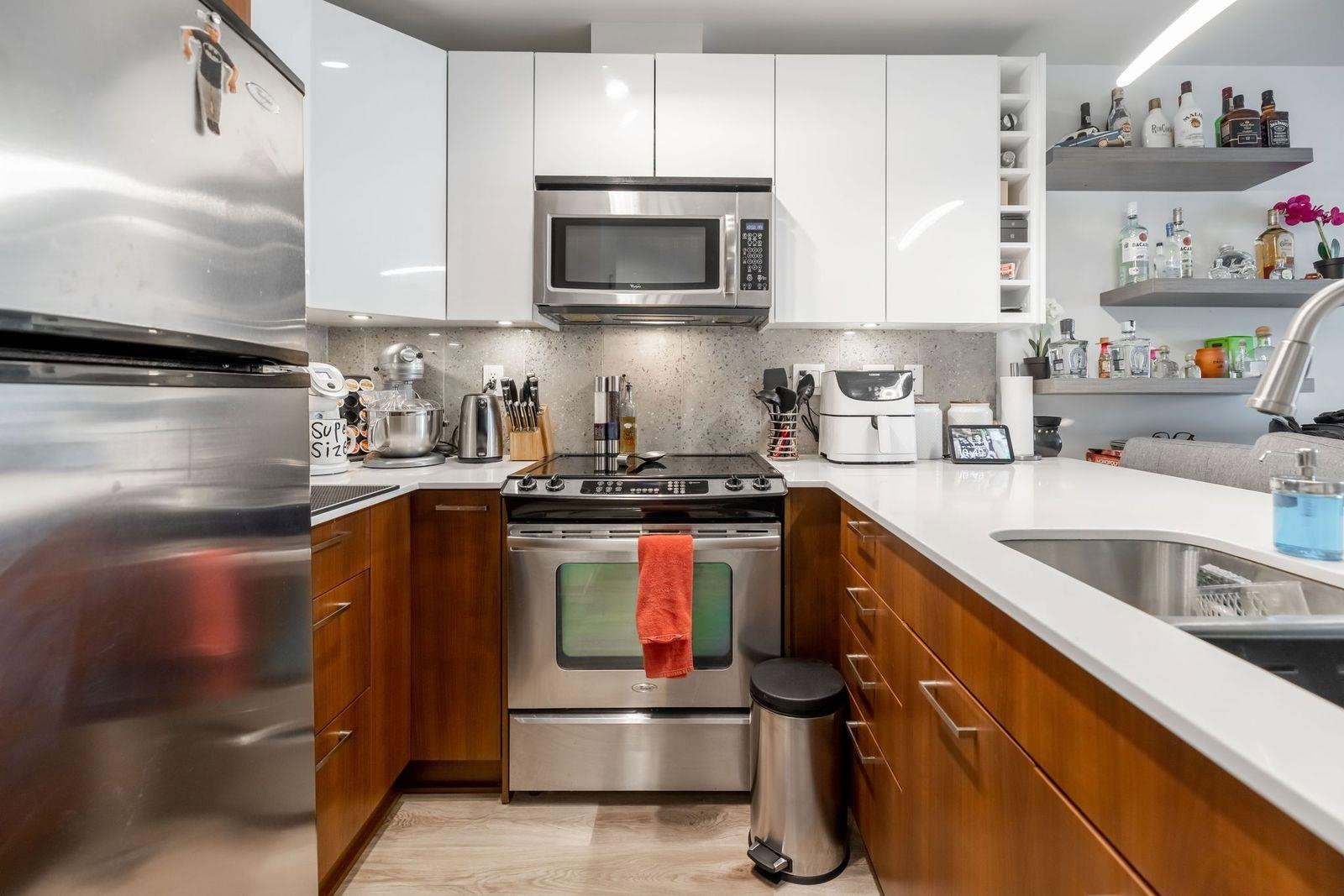 Beautifully updated 1 bedroom & Den unit facing SOUTH in The ELEMENT! Step inside to this bright unit w fresh warm paint tones, updated flooring, lighting fixtures & quartz countertops. Den could be a seceond bedroom. Updated washroom. Deck off living area is a great place to enjoy a morning coffee. This is a perfect opportunity to get your foot in the door in Surrey’s growing real estate market. This unit also offers 1 parking as well as 1 underground storage locker! Of course, one of the best features is your location, footsteps to shopping, transit, SFU Surrey and recreation, Call now for your personal tour!