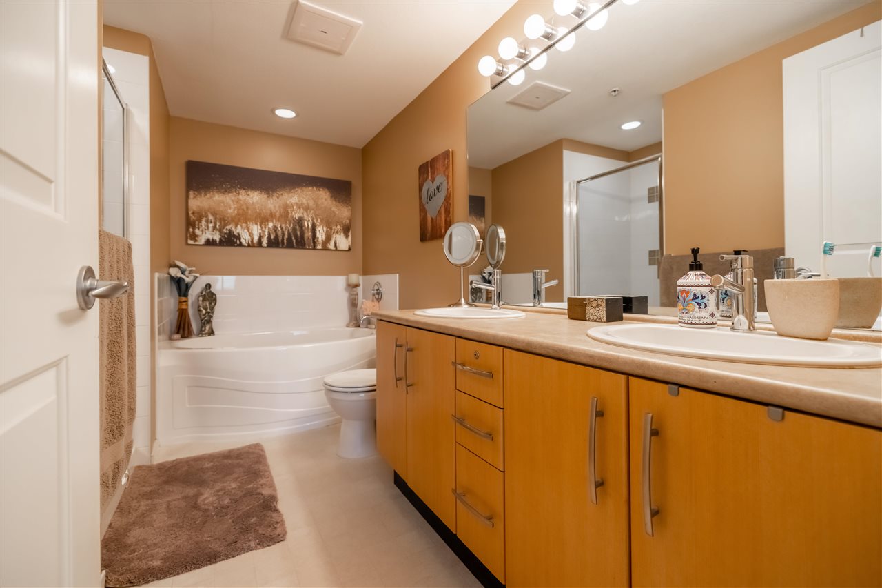 Beautiful 2 brdm, 2 bath CORNER unit in the TIDES! Great floor plan offering loads of light facing South all in 1050 sq ft. Bedrooms on opposite sides for ultimate privacy. Master bdrm has soaker tub & dual sinks! The Kitchen offers gas range and sliding door leading to private covered deck. Spacious living area w room for your formal dining table. Enjoy all the amenities the Canoe Club offers including an outdoor pool, a hot tub, a gym, basketball court, theatre room, tennis court and guest suites! Be apart of the lifestyle of Port Moody. Walk to the Skytrain, Brewers’ Row, restaurants, Rocky Point park & Shopping. Secured parking stall . A great place to call home!