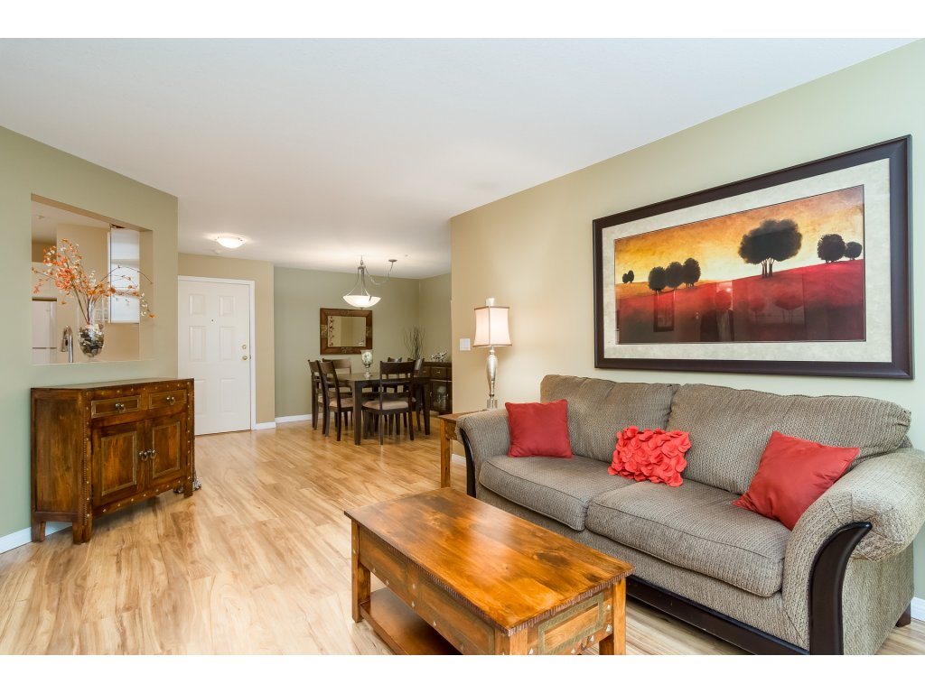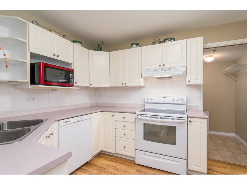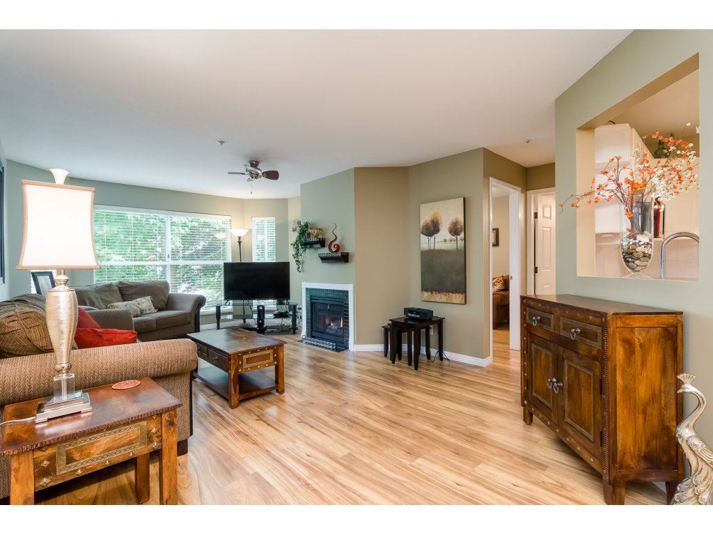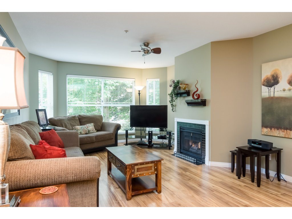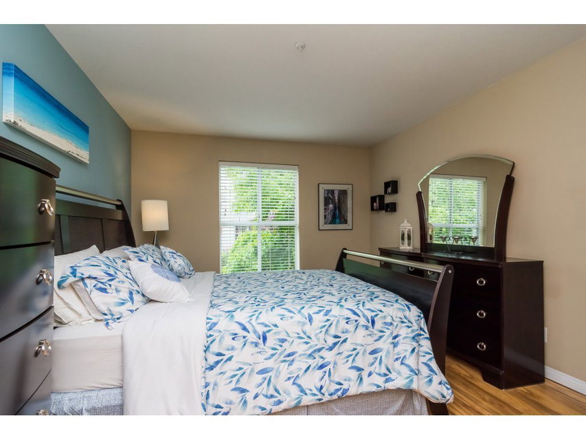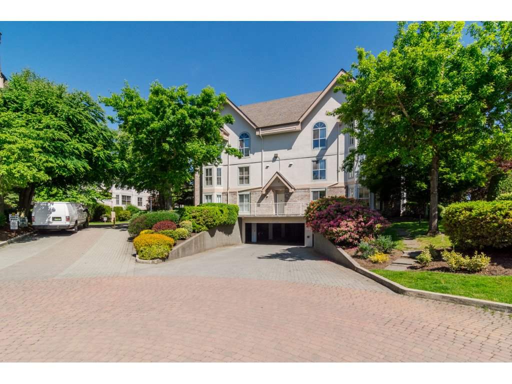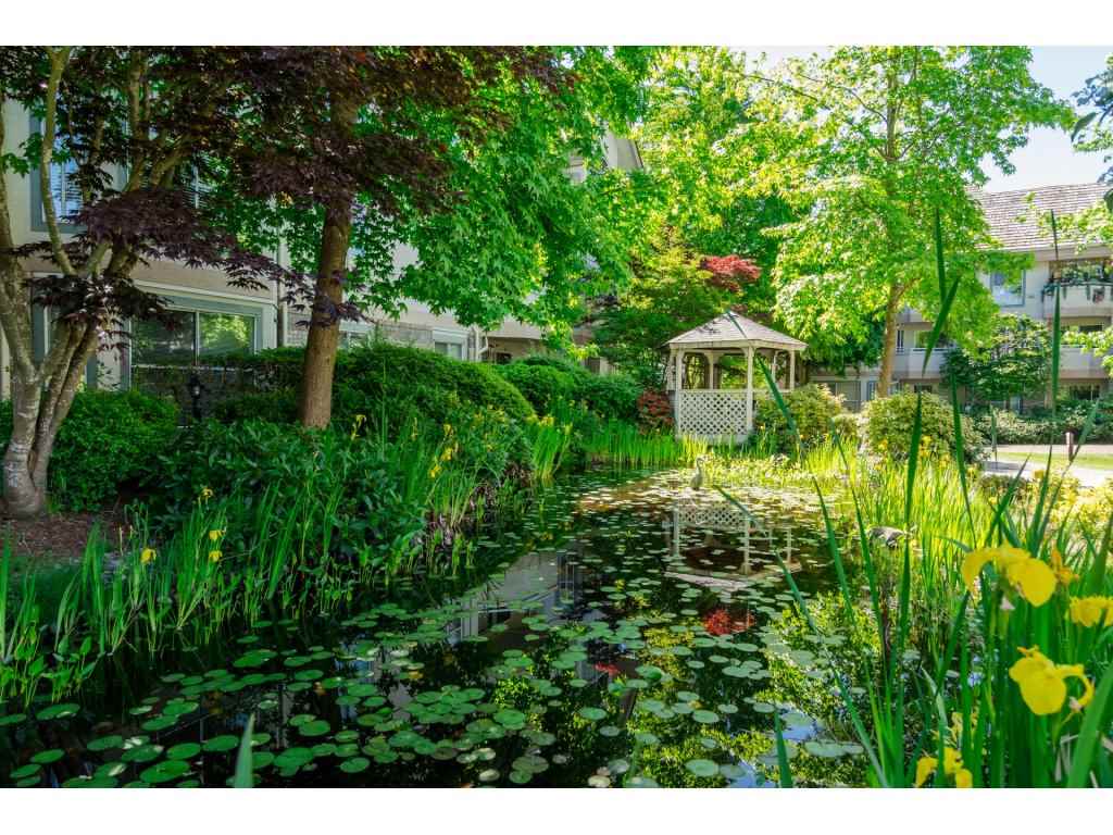 THE HIGHLANDS! SPOTLESS 2 bedroom, 2 bath 1025 sq ft condo facing the quiet inner courtyard overlooking the pond! Open floor plan with bedrooms on opposite sides offering loads of privacy. New laminate floors and warm paint colors. Cozy gas fireplace in living room. White kitchen with adjoining insuite laundry & extra storage room. Large master bedroom with walk through closets and totally renovated gorgeous ensuite with oversized glass shower! This is perfect for downsizers or first time buyers. Underground secured parking & storage locker. Great complex with brand new roof & proactive strata. Maint fee includes infloor radiant heat & gas fireplace. Footsteps to Shopping, Restaurants and Bus loop! PRICED TO SELL!