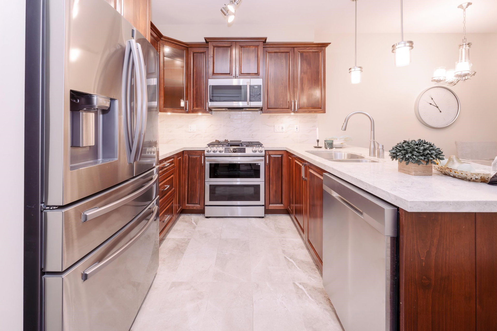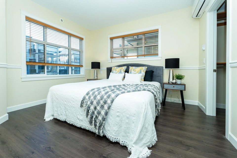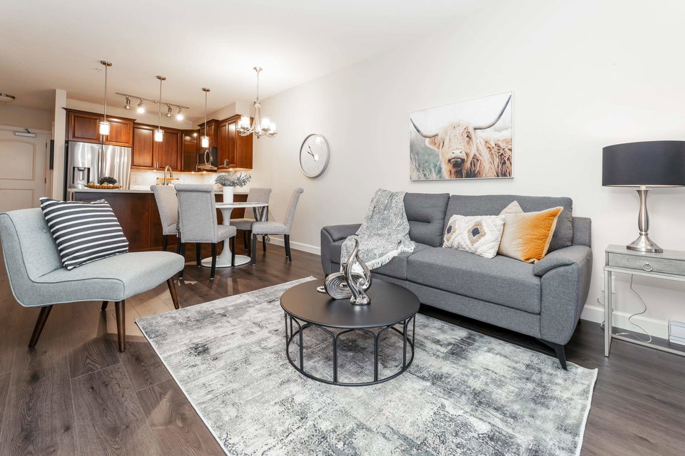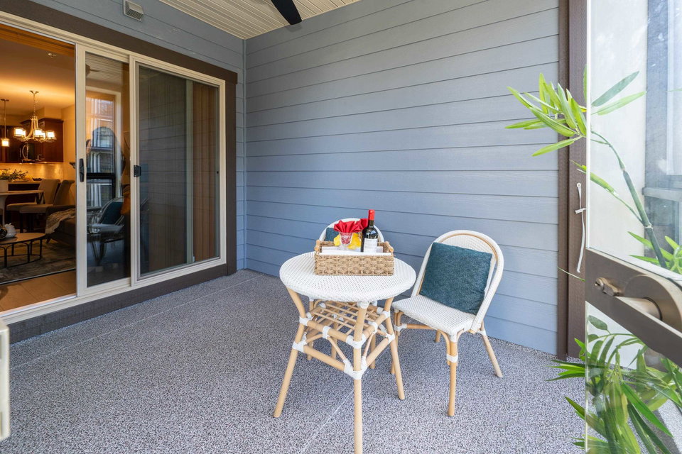 Enjoy Peaceful Mountain Views from This Bright Corner Unit! Discover this charming two-bedroom, two-bathroom corner unit in Yorkston Park! With an open concept design and 9-foot ceilings, the space feels expansive and inviting. The modern kitchen boasts quartz countertops and stainless steel appliances, including a Samsung gas stove—ideal for cooking enthusiasts. Enjoy the comfort of air conditioning and a spacious walk-in closet, along with two side-by-side parking stalls and personal storage. Step onto the sundeck and unwind as you take in the serene views of the peaks of Golden Ears Mountain Range. Located beside the stairwell, this unit offers easy access and privacy. Don’t miss your chance to own this beautiful property!