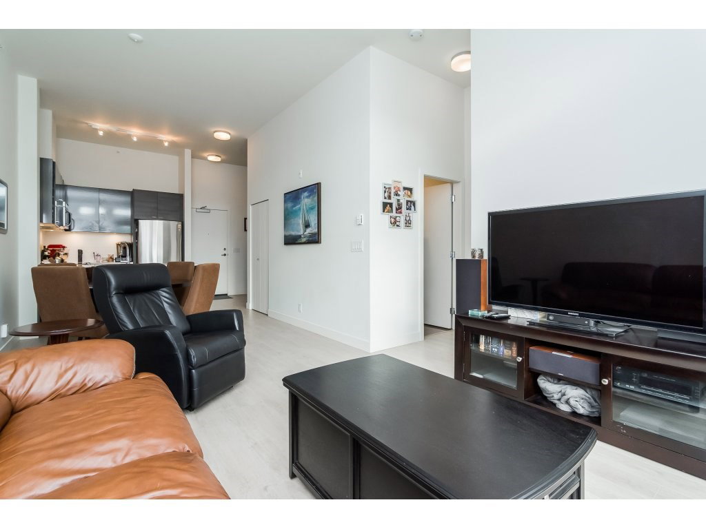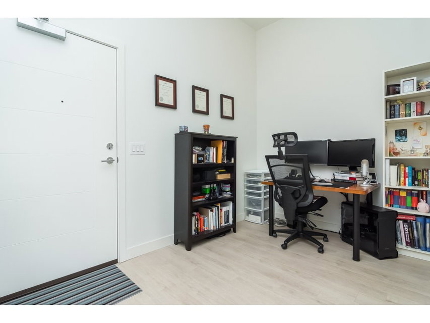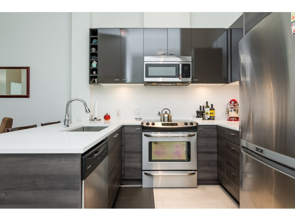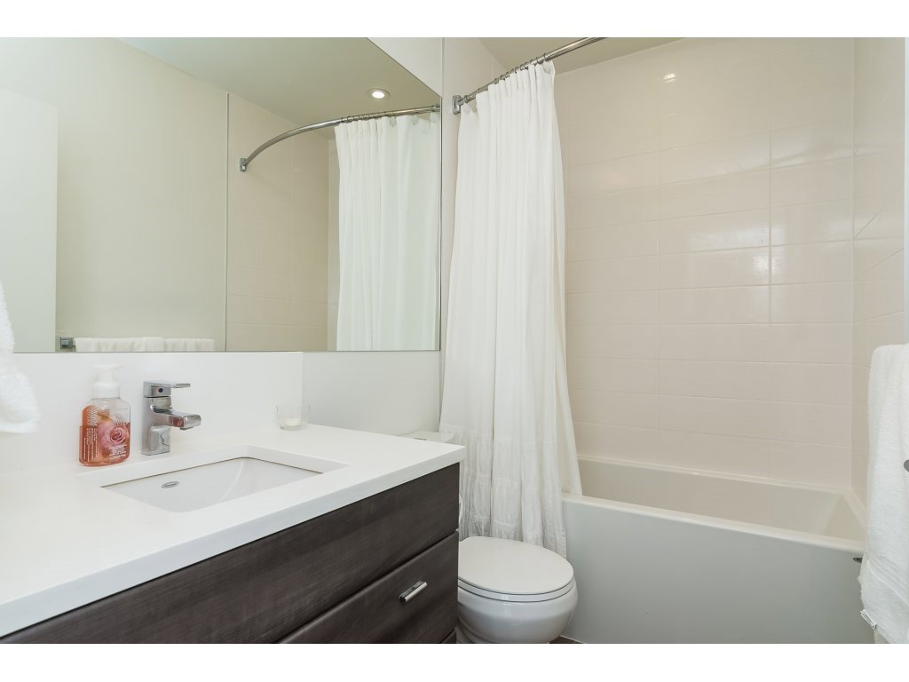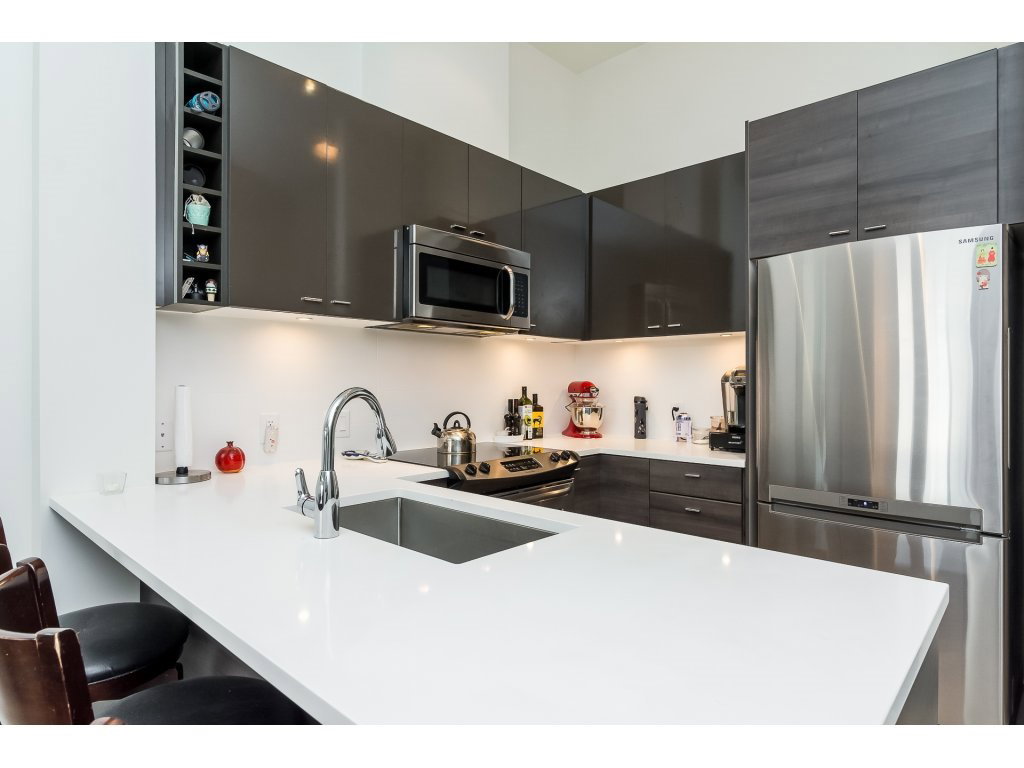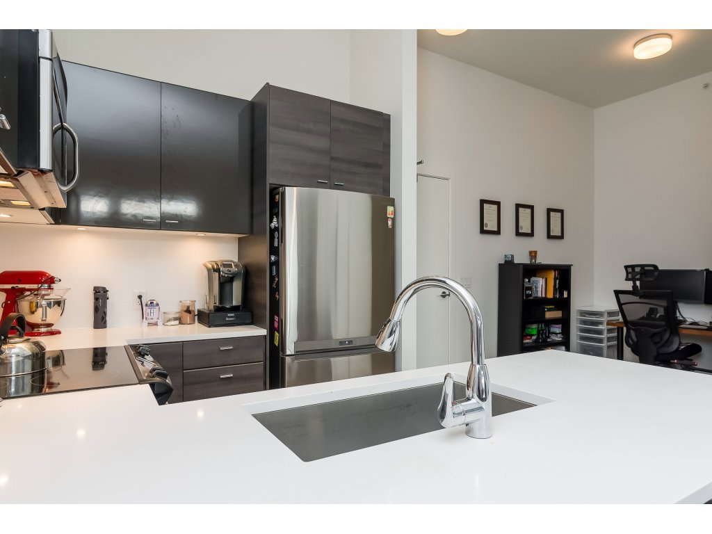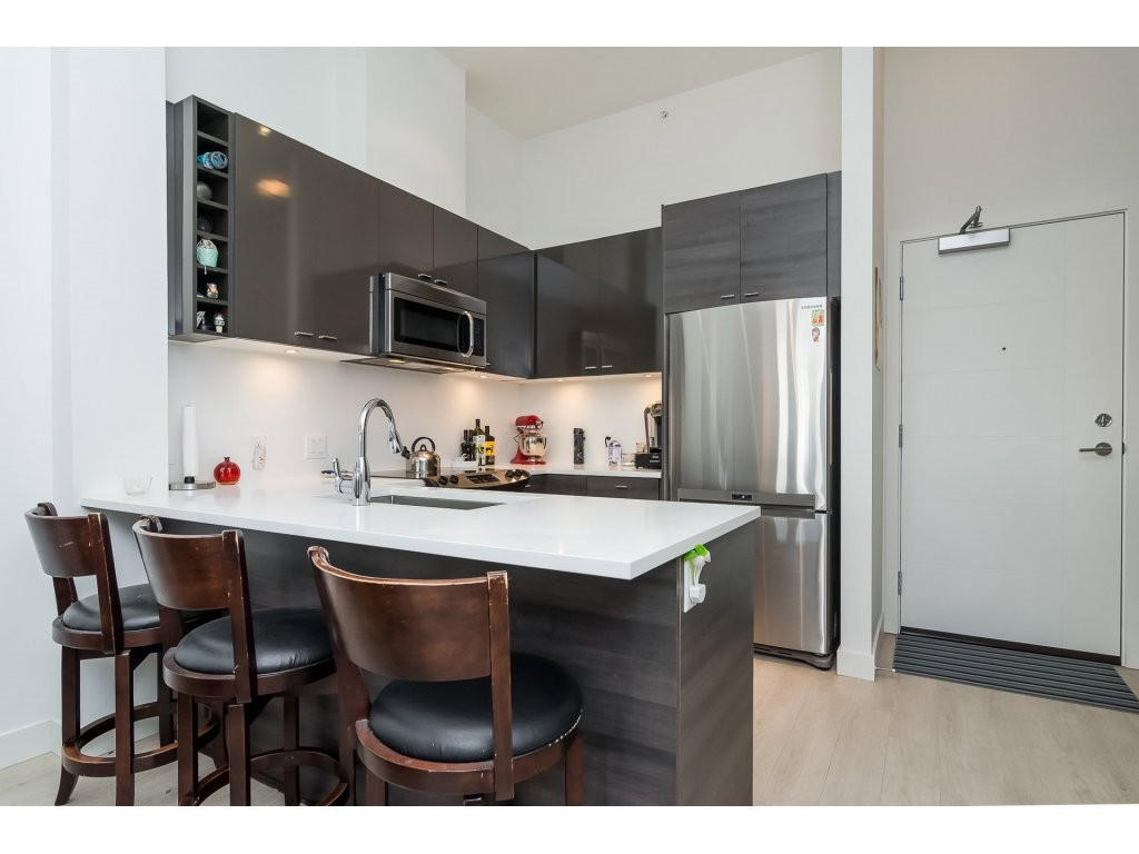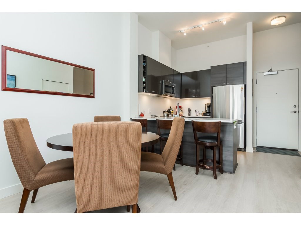 Welcome to the VERVE by PORTE! Attention FIRST TIME buyers and INVESTORS! MINT CONDITION TOP FLOOR 1 bdrm & den. 700 sq ft unit! This contemporary & modern development is one of the best in Central City & only a 5 min walk to Skytrain. 4 yrs old! OPEN, bright layout w 12′ high ceilings, stainless steel appliances, quartz counter tops, under mount sink & room for your bar stools at breakfast bar for entertaining! Beautiful laminate floors in kitchen, dining & living room. Warm paint colors! Great private patio facing EAST to enjoy the morning sun! Secured Underground parking and locker. Footsteps to SFU Campus & Central City Mall in BC’s Fastest growing city ! RENTALS ALLOWED! LIKE NEW! ACT FAST!