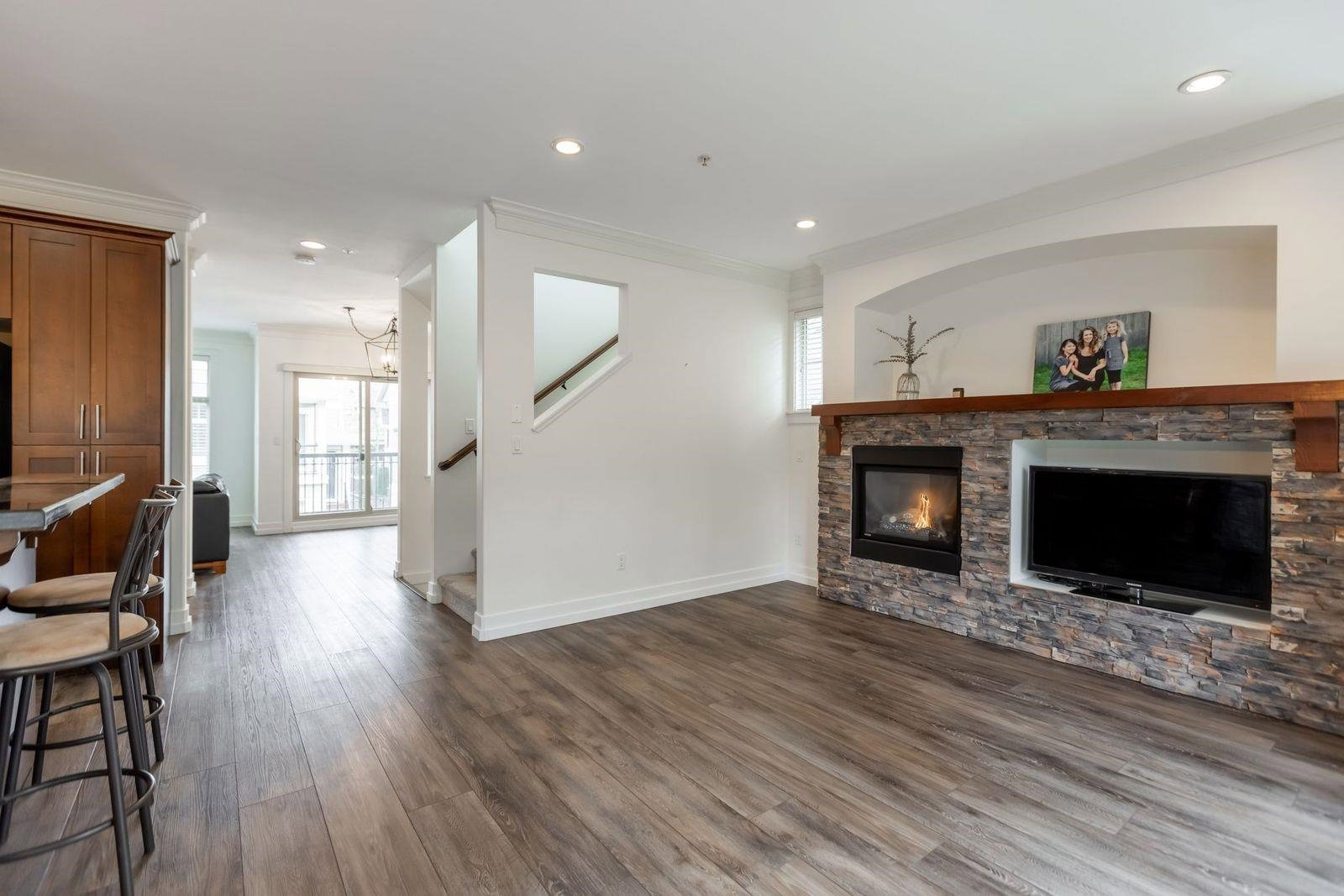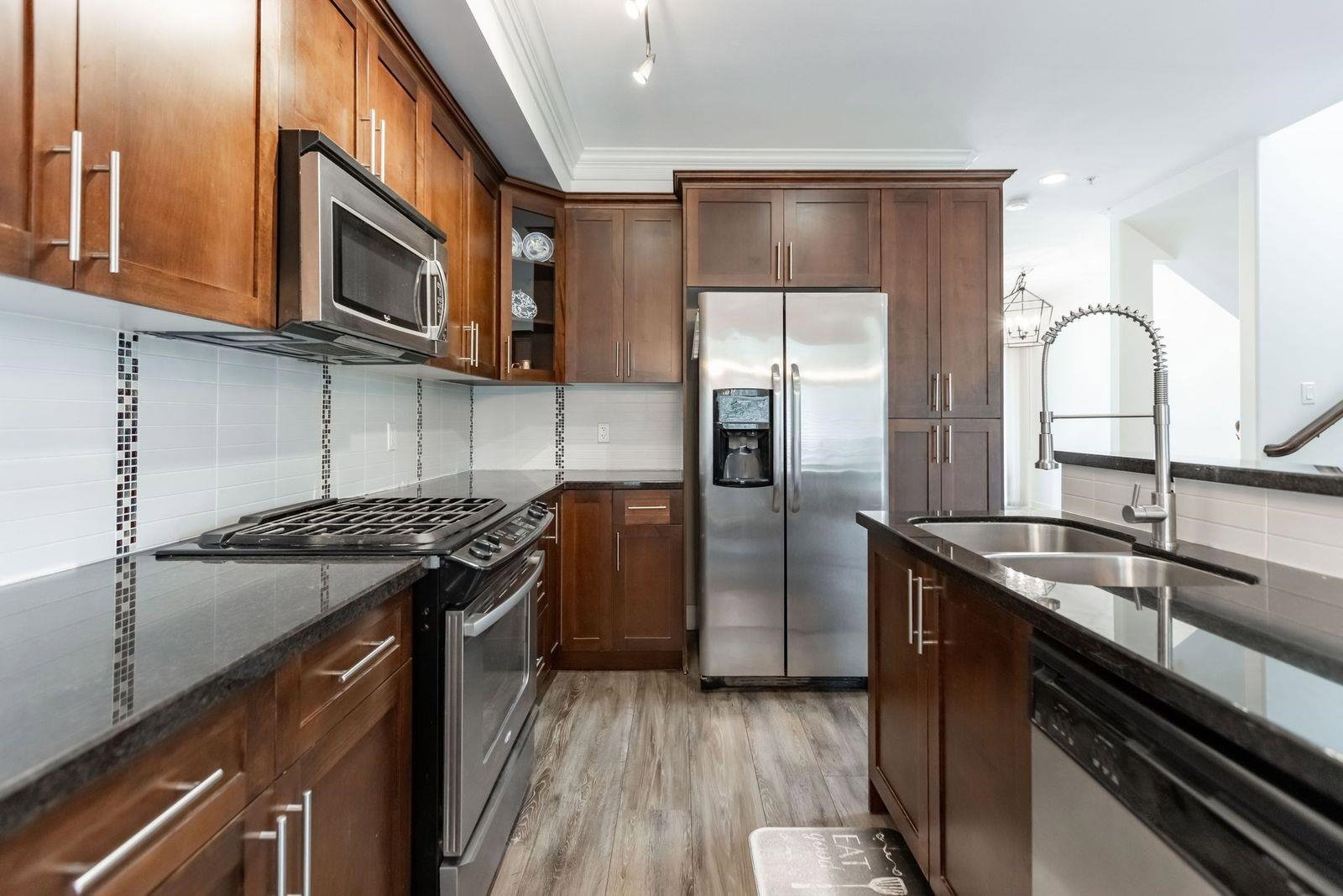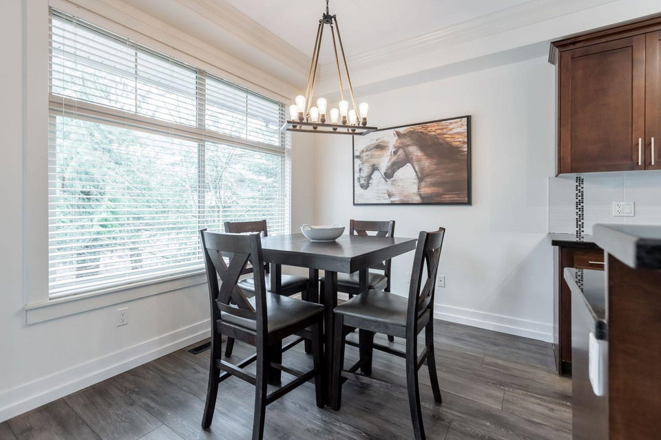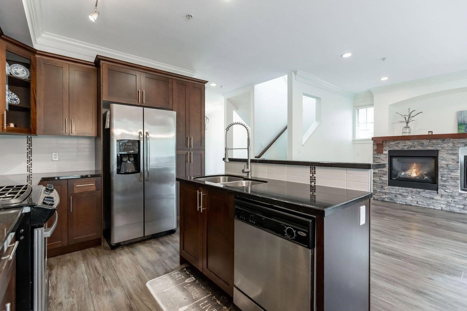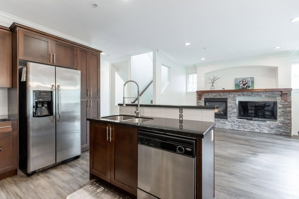 MURRAYS LANDING in the Heart of Murrayville! This incredible 4 bedroom, 4 bath END UNIT townhouse in located in the quiet part of the complex and offers it all. Over 2000 sq ft of living space! Double car garage w visitor parking next to unit. Spacious living area w formal dining room. Open kitchen w area for your bar stools, stainless steel appliances, gas range, granite countertops all overlooking large family area w gas fireplace. Loads of windows throughout. Unit has 3 decks for entertaining. 3 bedrooms upstairs & laundry. Great master suite. Walkout basement w rec room, great guest room bedroom & full washroom. Covered back patio area is a great spot to enjoy a book or enjoy a glass of wine. Walking distance to Shoppers, IGA, W.C. Blair Rec center, coffee shops & more.Great location!