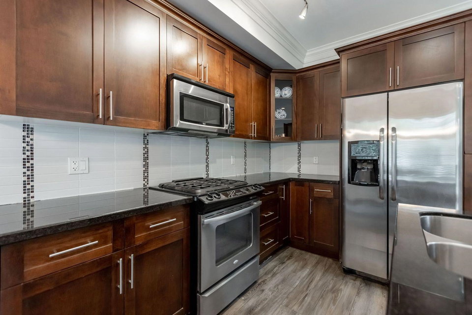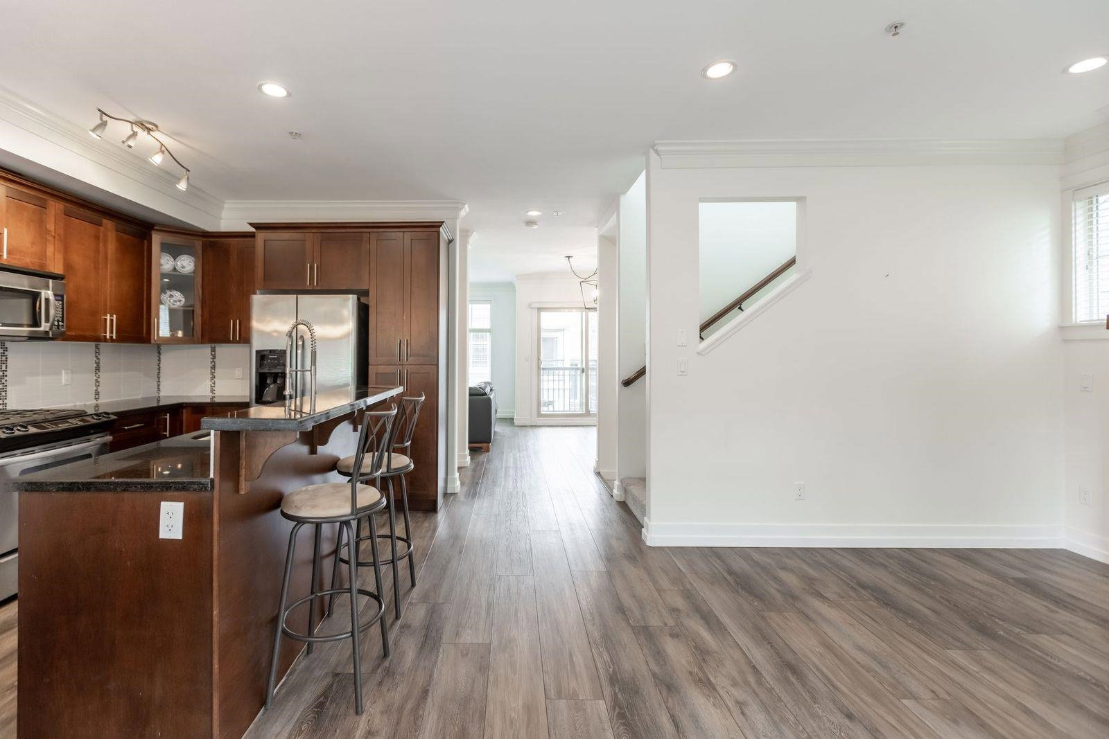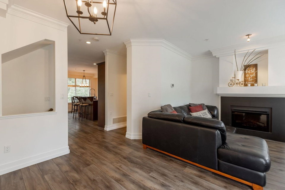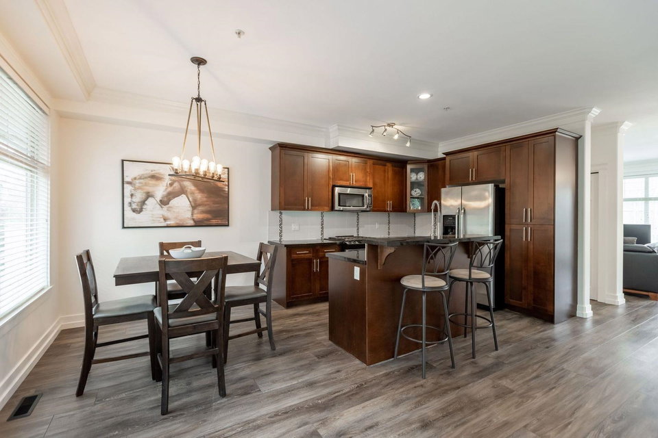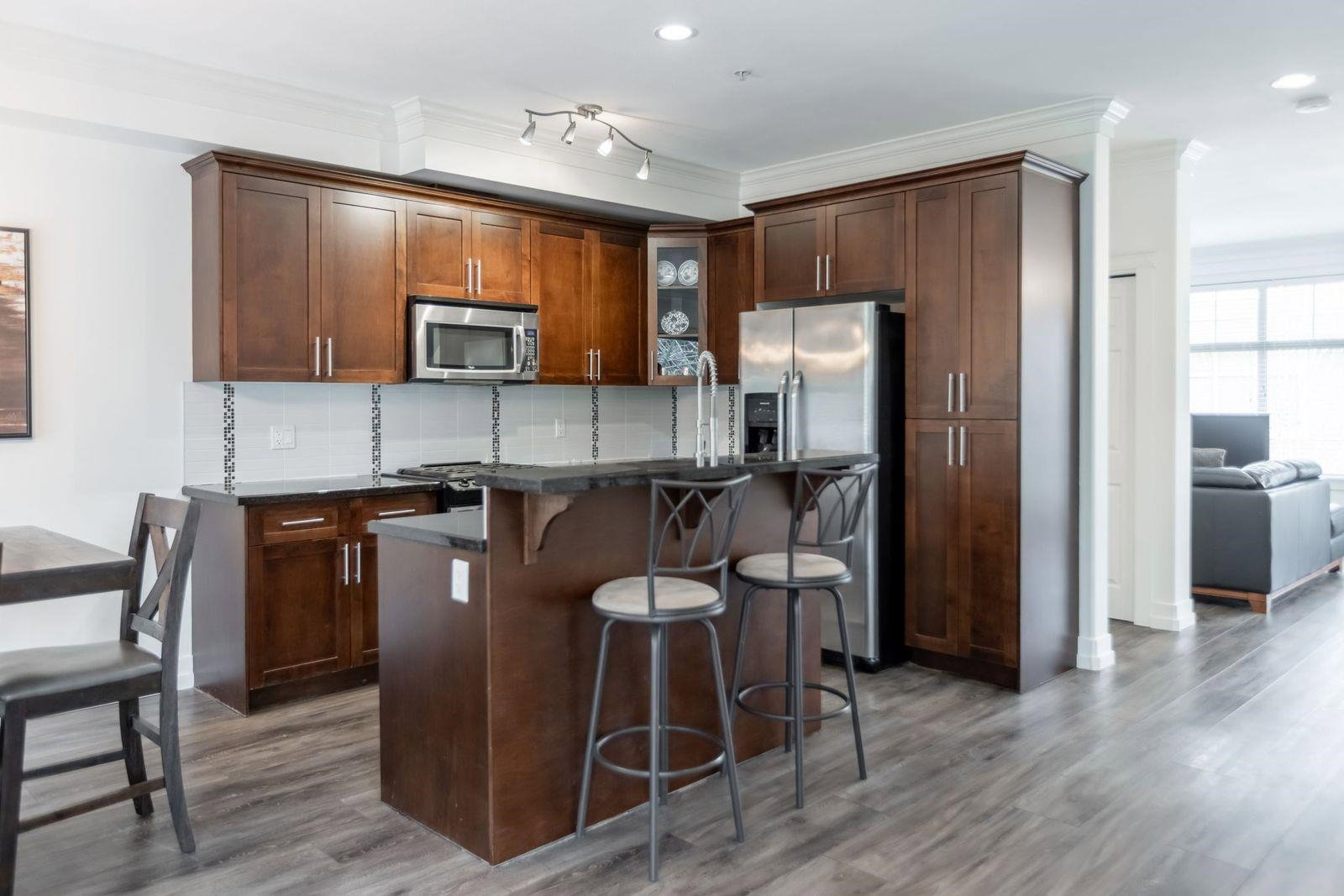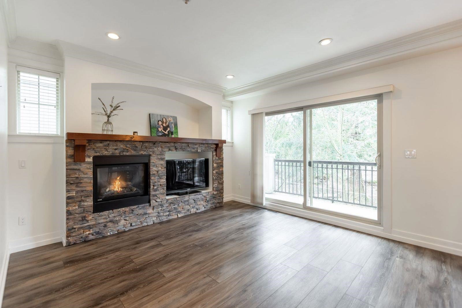 MURRAYS LANDING in the Heart of Murrayville! This incredible 4 bedroom, 4 bath END UNIT townhouse in located in the quiet part of the complex and offers it all. Over 2000 sq ft of living space! Double car garage w visitor parking next to unit. Spacious living area w formal dining room. Open kitchen w area for your bar stools, stainless steel appliances, gas range, granite countertops all overlooking large family area w gas fireplace. Loads of windows throughout. Unit has 3 decks for entertaining. 3 bedrooms upstairs & laundry. Great master suite. Walkout basement w rec room, great guest room bedroom & full washroom. Covered back patio area is a great spot to enjoy a book or enjoy a glass of wine. Walking distance to Shoppers, IGA, W.C. Blair Rec center, coffee shops & more.Great location!
