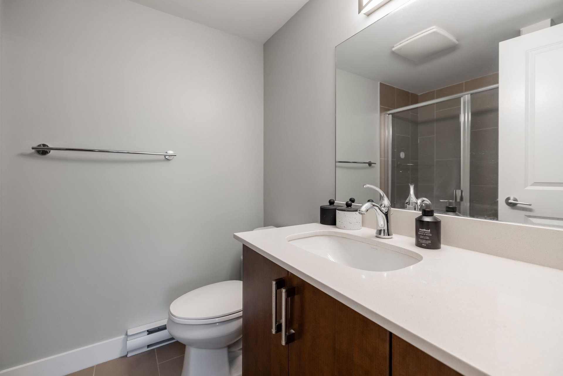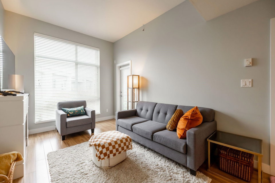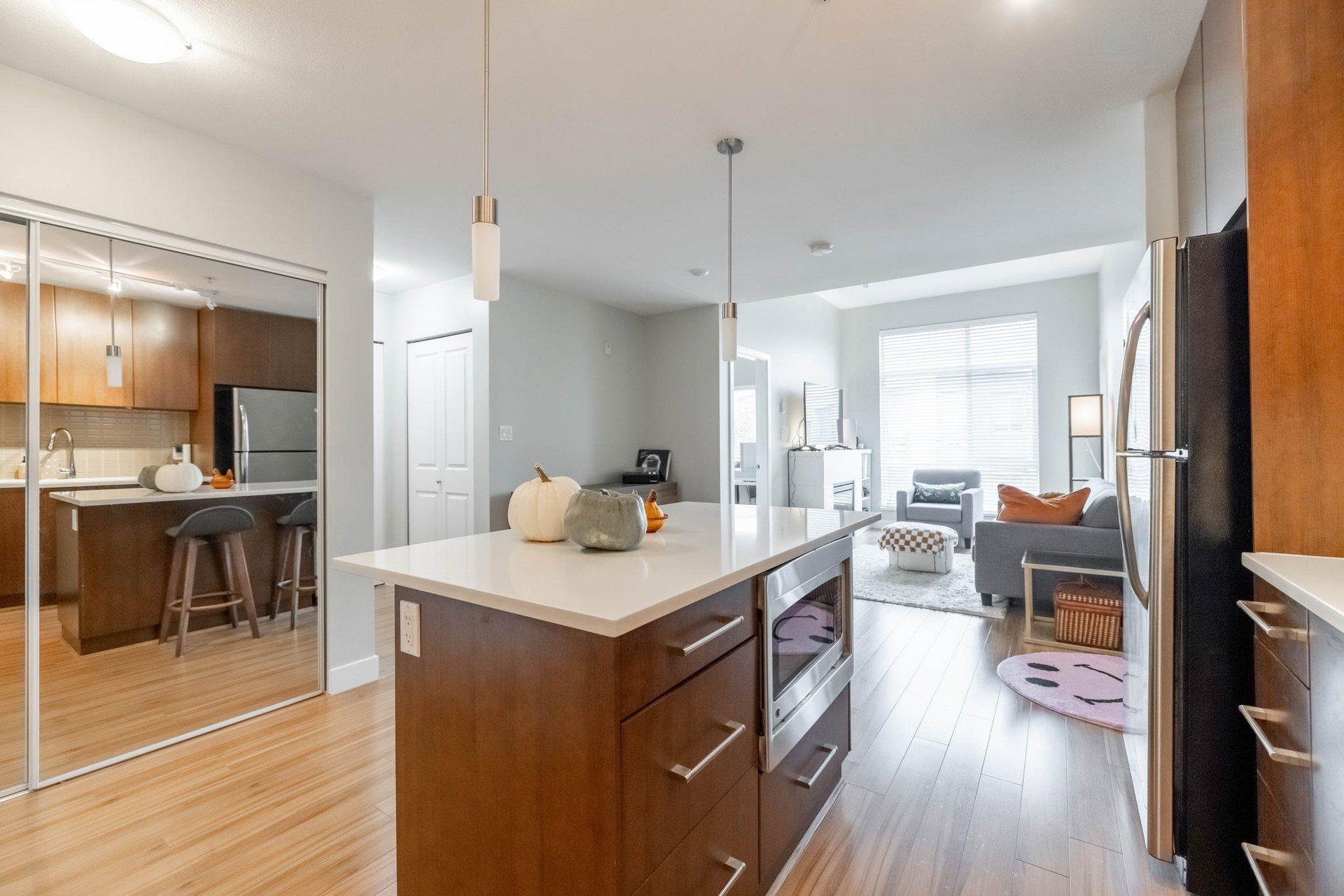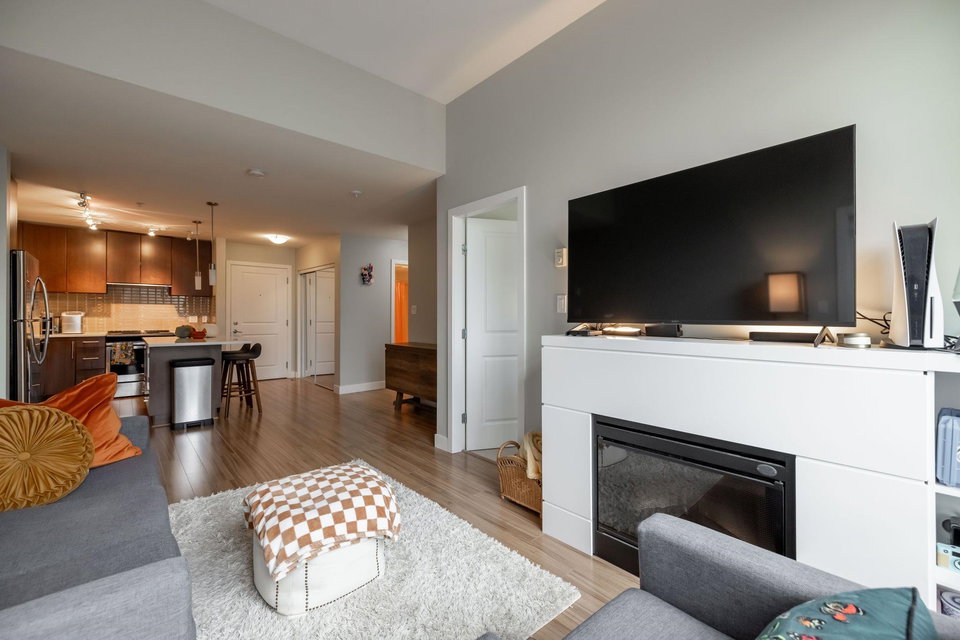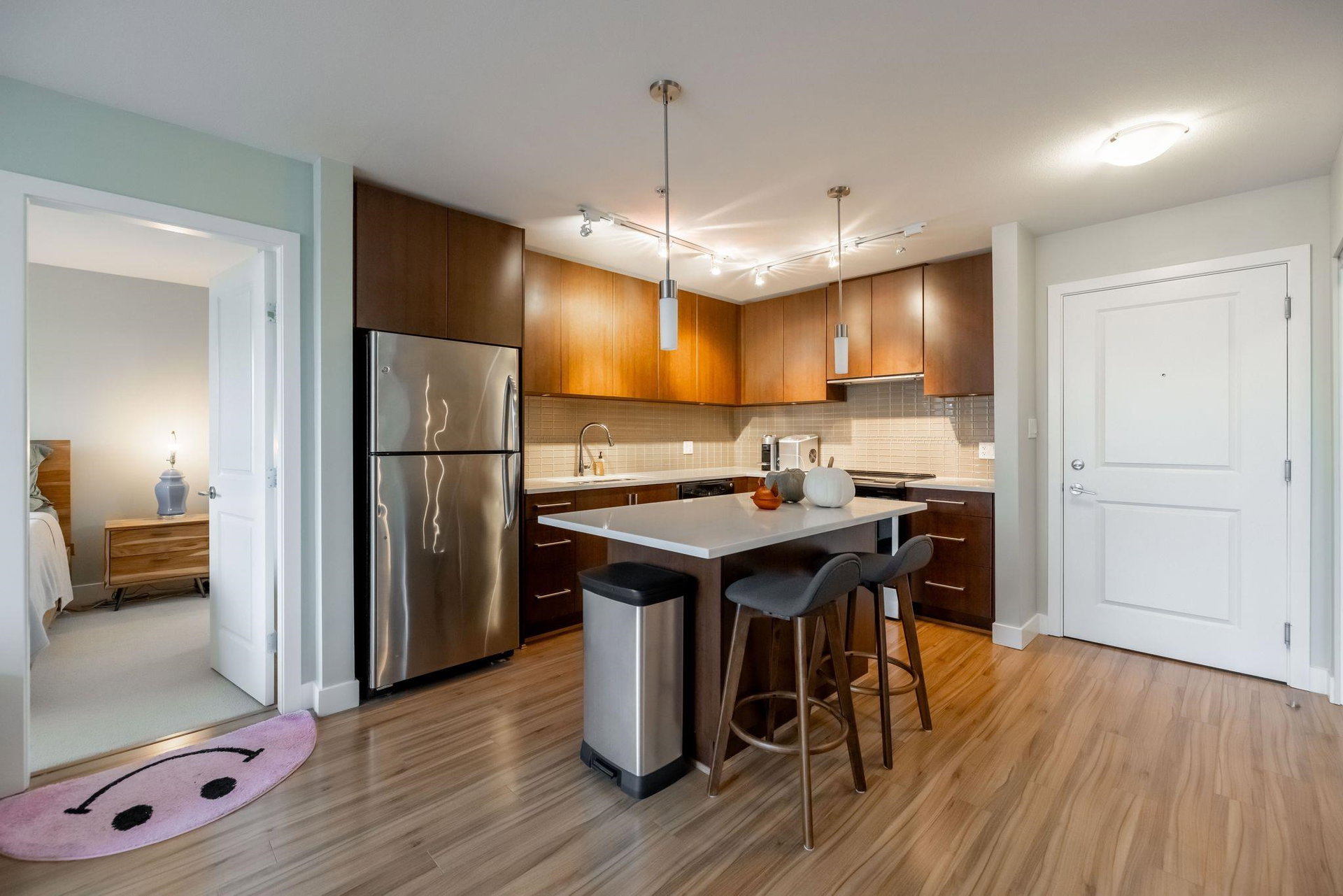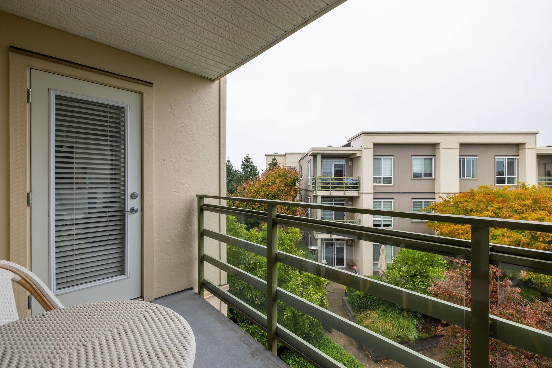 Welcome to the SUMMIT HOUSE at Morgan Crossing! We are proud to showcase this spotless 2 bedroom 2 bath TOP FLOOR unit overlooking the serenity of the rooftop green space the complex is known for! 2 bedrooms on opposite sides of the unit and 10 foot ceilings in the living room! Kitchen features quartz countertops, stainless appliances and gas stove! Underground secured parking stall & storage locker. Unit in fantastic condition in great complex! Morgan Crossing features 60+ shops and walking distance to all levels of schooling, shopping, parks and convenient highway access! This will not last, call now for your personal tour!