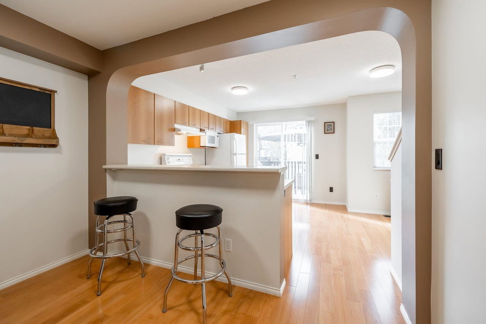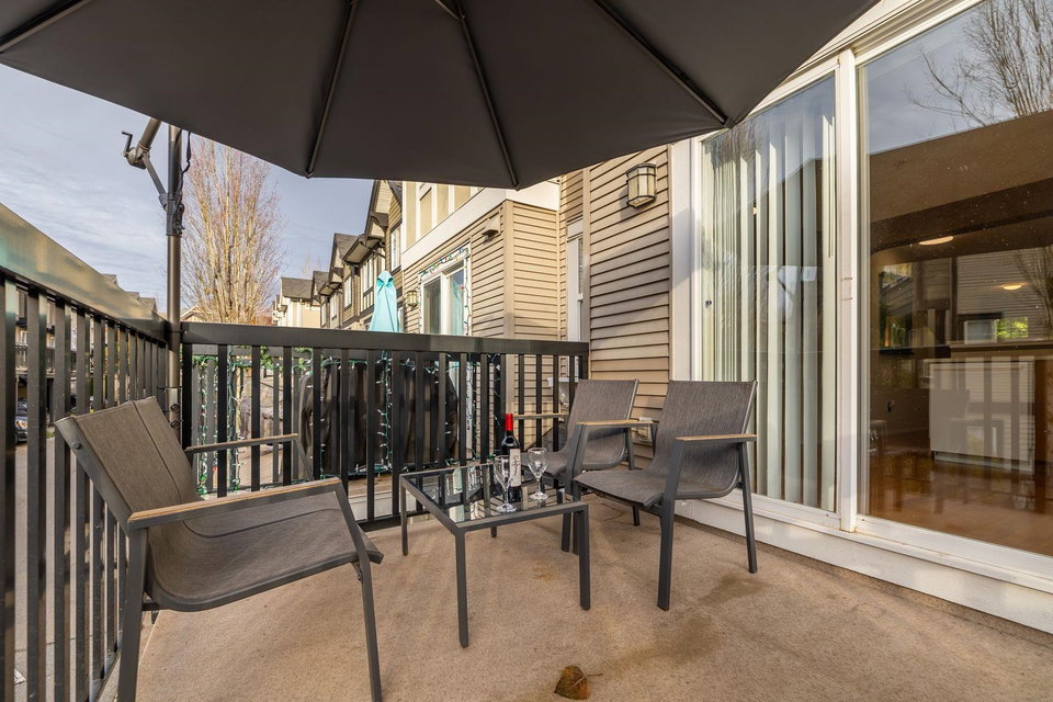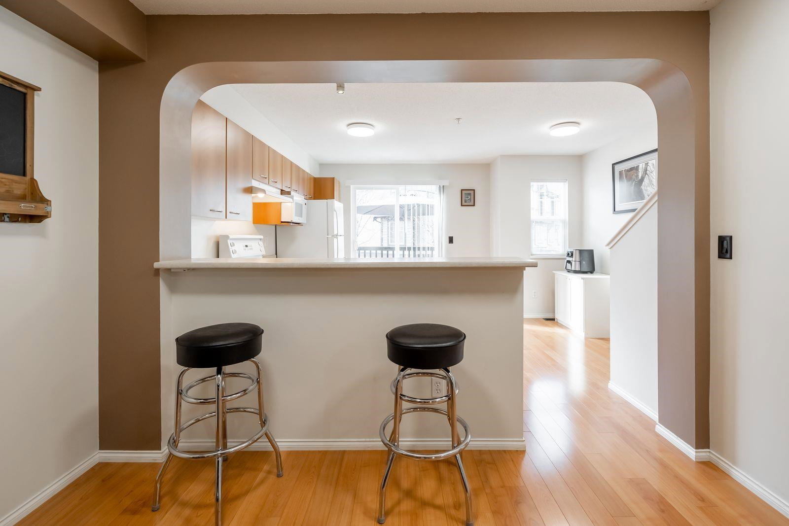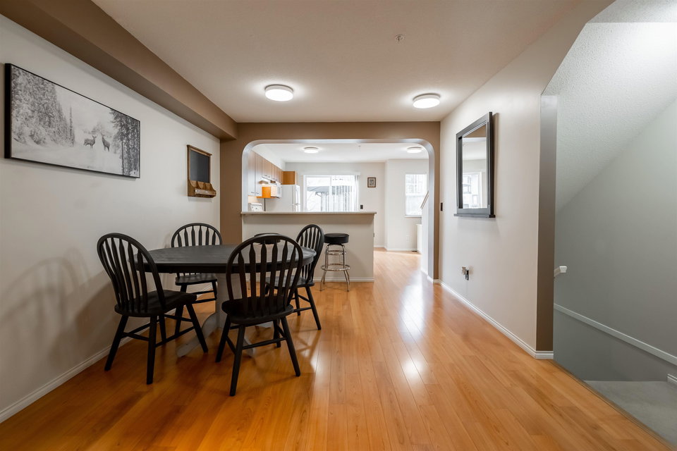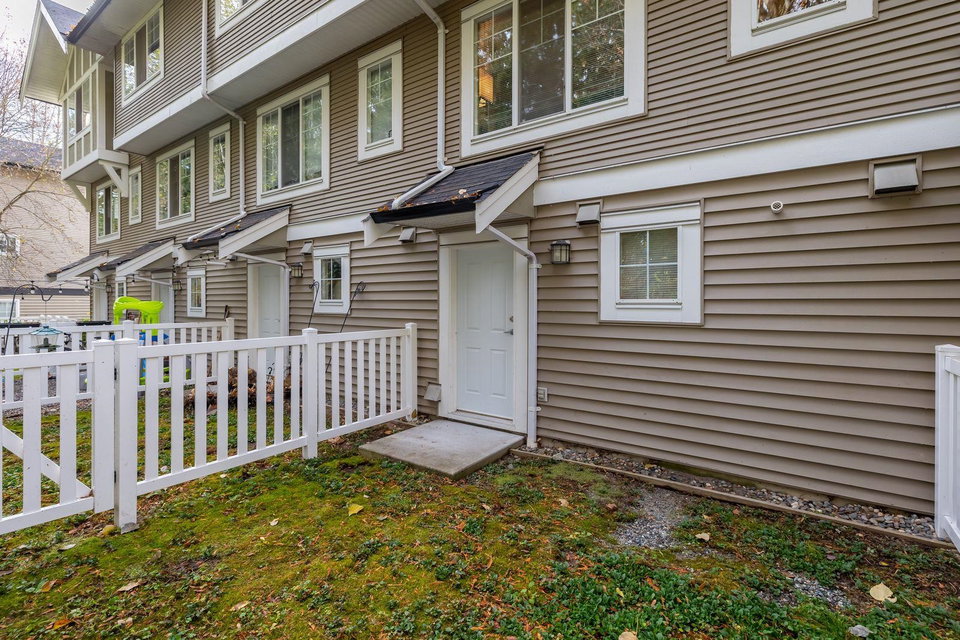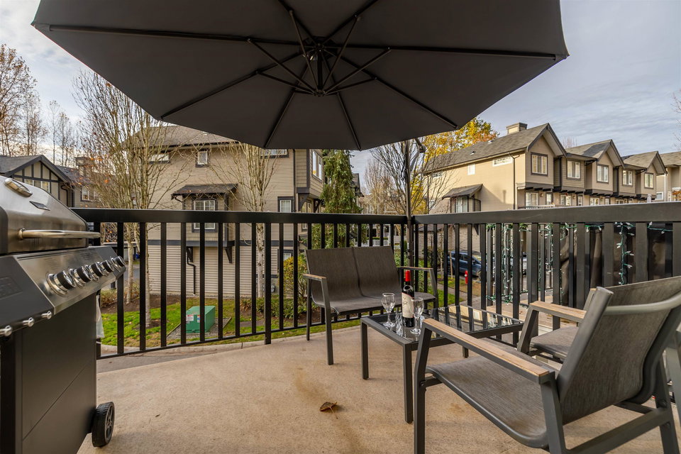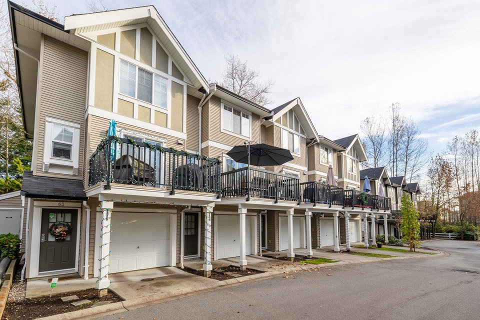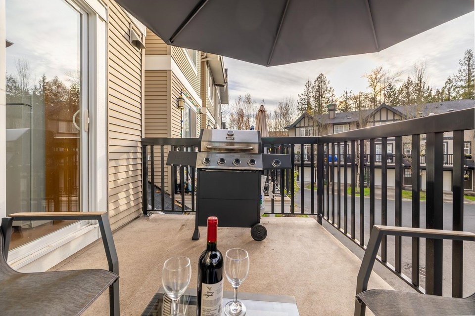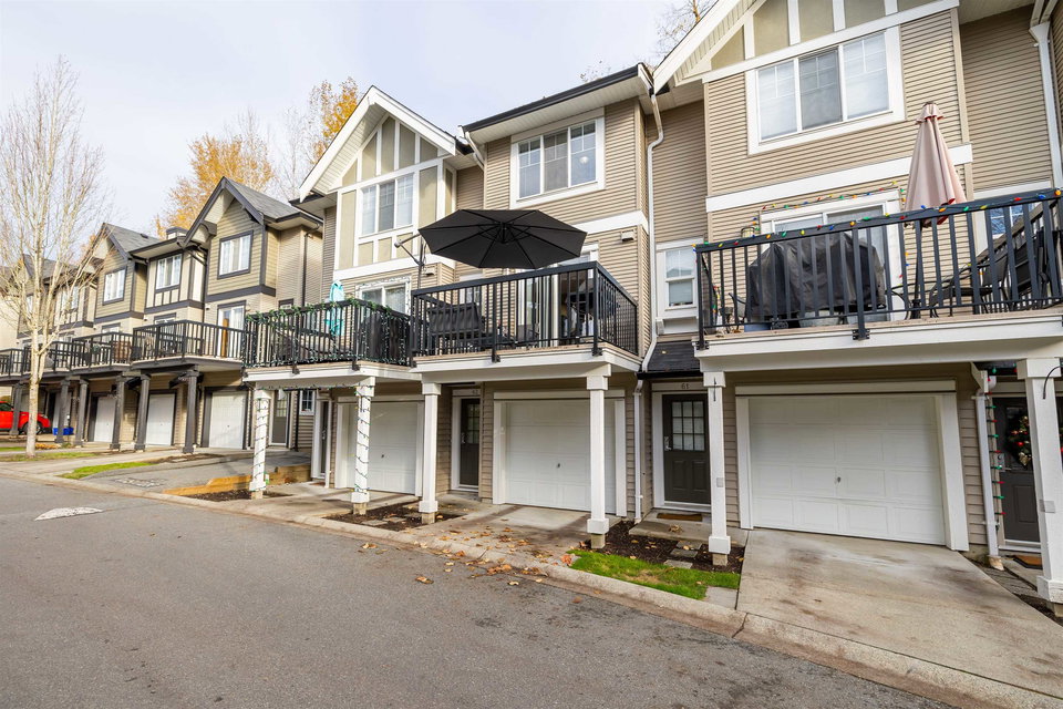 Welcome to STEEPLECHASE in Willoughby heights! Incredible value for this 2 bedroom 2 bath 1265 sq ft townhouse backing onto GREENSPACE! Open layout with gas fireplace in living area overlooking the private backyard. Laminate floors on main floor. Room for large dining table & bar stools at kitchen. White appliances w maple color wrapped cabinets. Sliding door off kitchen leads to WEST facing deck. Perfect spot for bbqing & entertaining. 2 spacious bedrooms upstairs. Master suite has ensuite bathroom w double sinks. 2 car covered garage w extra space for storage. Door off garage leads to fenced backyard overlooking the quiet parkland. Unit has lots of visit parking around. 2 year old furnace & 1 yr old hot water tank. Footsteps to shopping, restaurants, Costco, Save on and more!