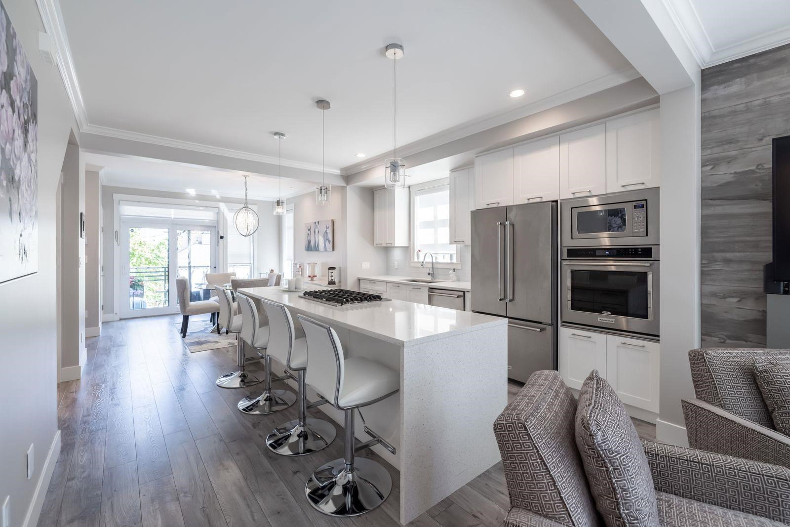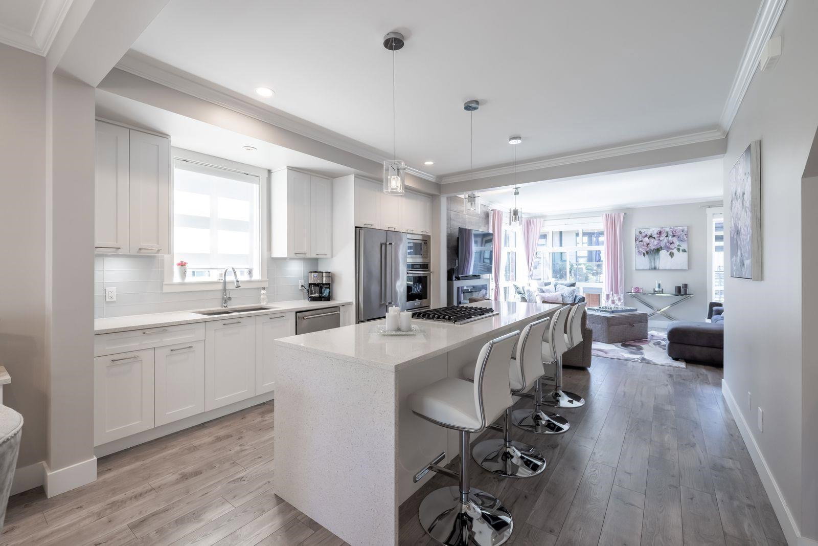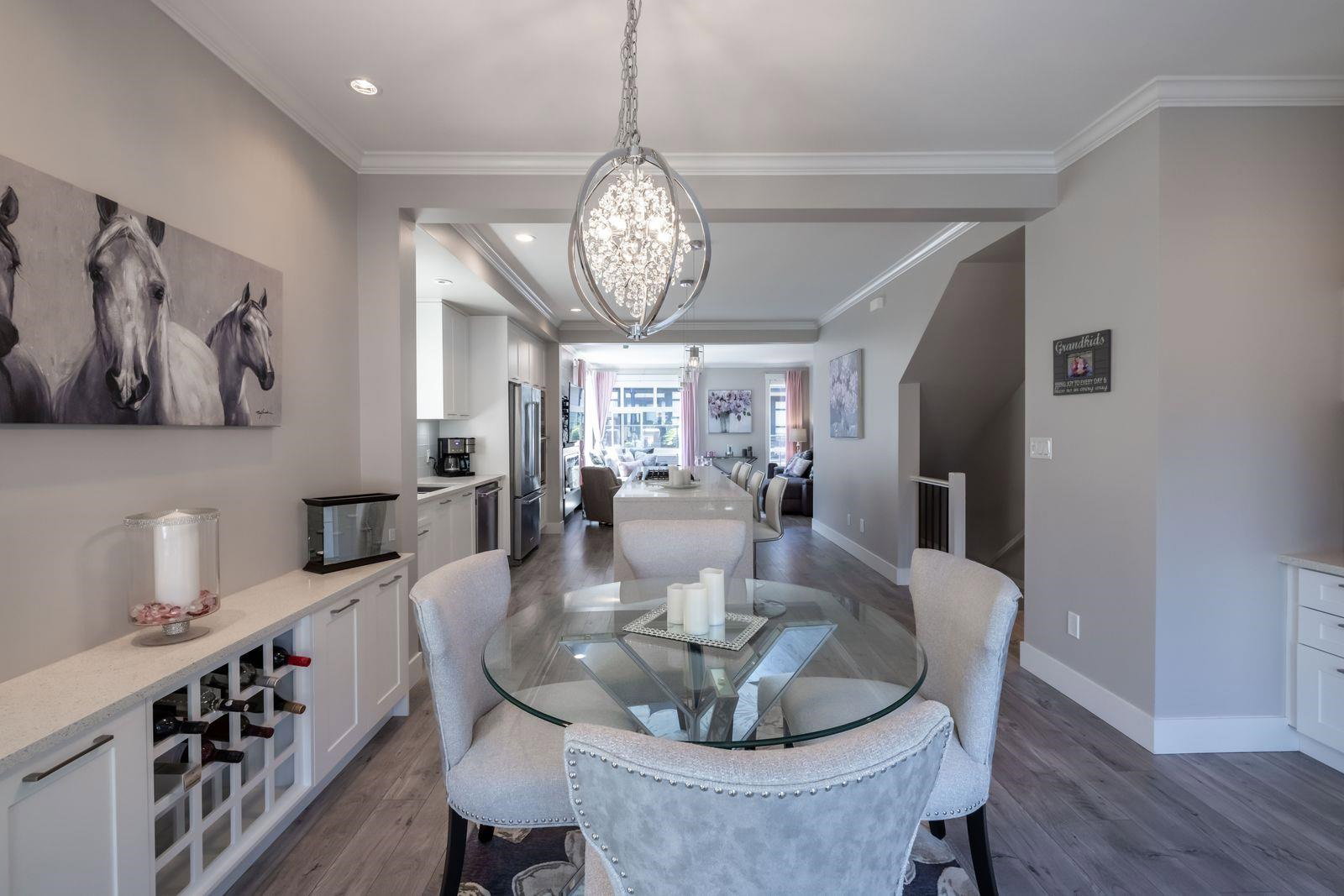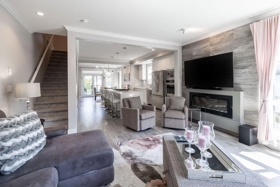 HARVEST AT BOSE FARMS! END UNIT. One of the best locations in complex! Highly sought after development in the heart of CLOVERDALE! This modern designed 3 bdrm, 3 bath townhouse is only 5 years old & features a bright, open floor plan w 9′ ceilings, crown moldings, beautiful oversized island for entertaining & powder 2 piece on main floor! Gourmet kitchen w stainless steel appliances, gas range, under mount sink & room for bar stools. Stunning tiled living room feature wall with fireplace. Sliding door off dining area leads to your private back deck w built in gas bbq hookup! Spacious master bedroom w double sinks in ensuite & shower. Tankless hot water system. Fenced rear WRAP AROUND yard & patio area is perfect for your pet! Footsteps to Everything! 10 out of 10!