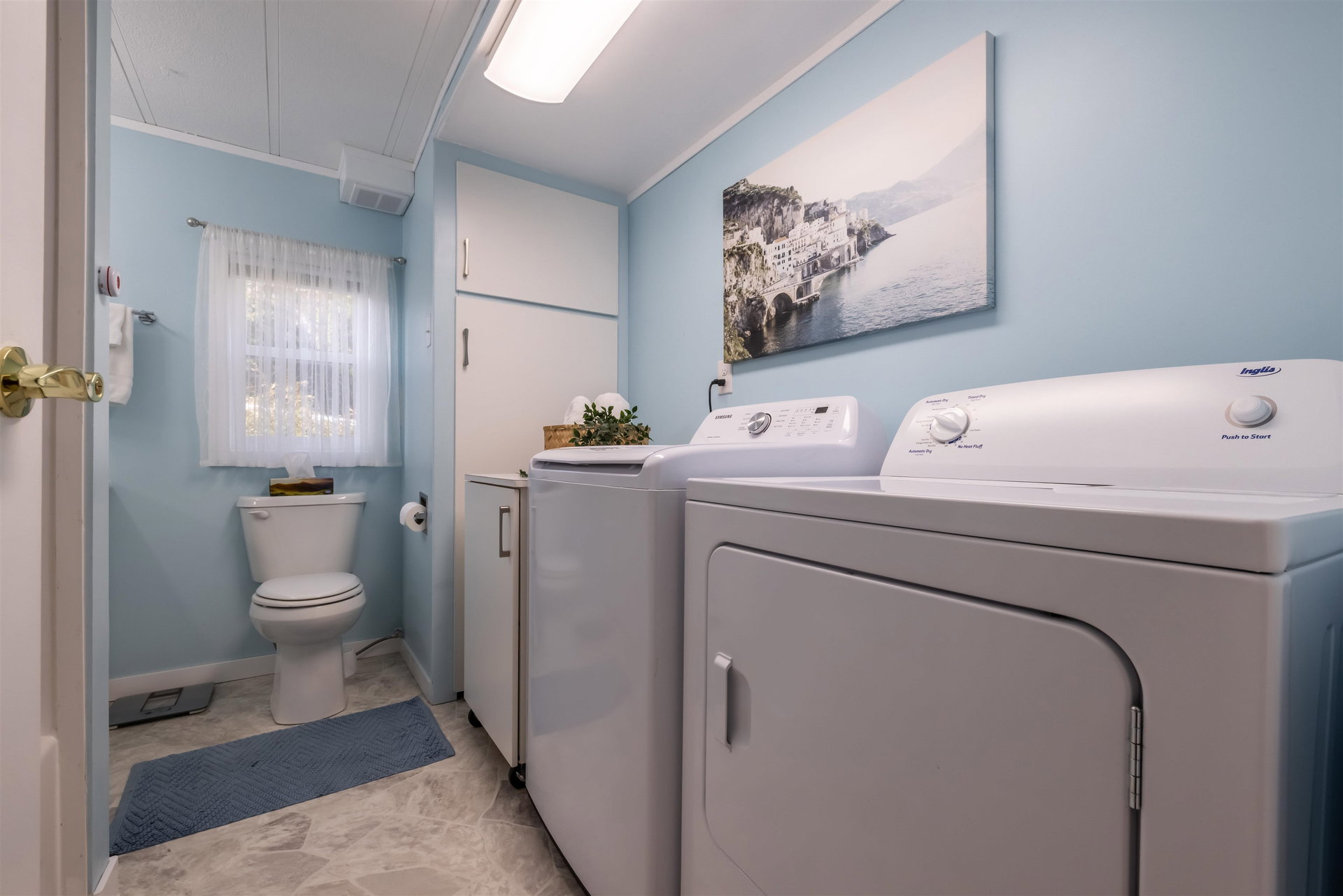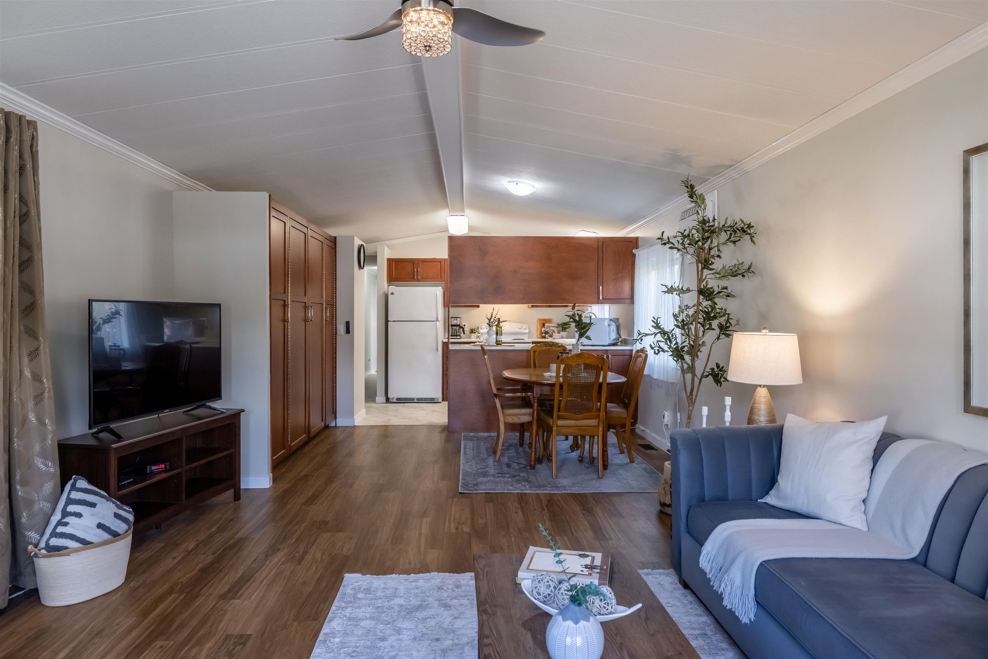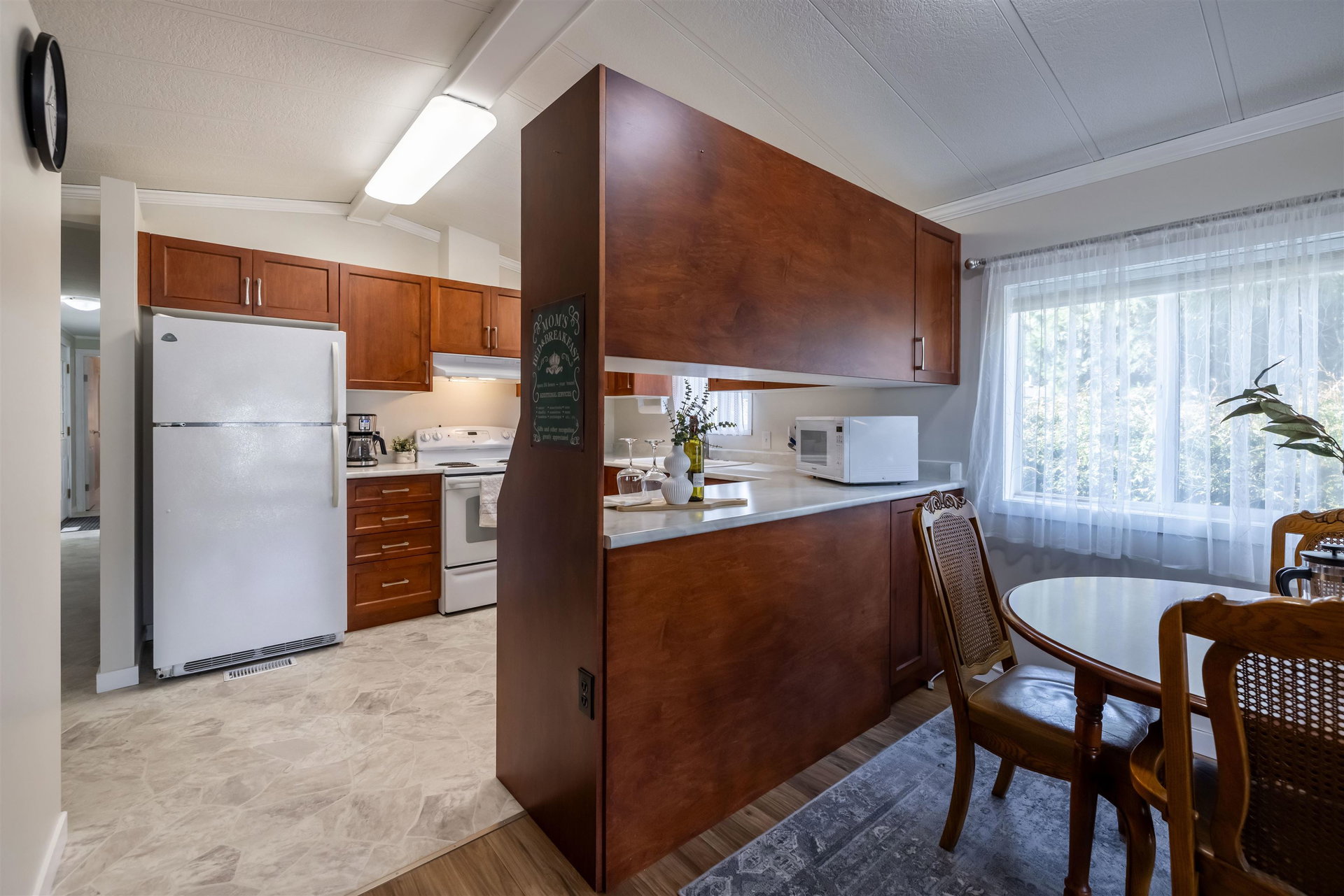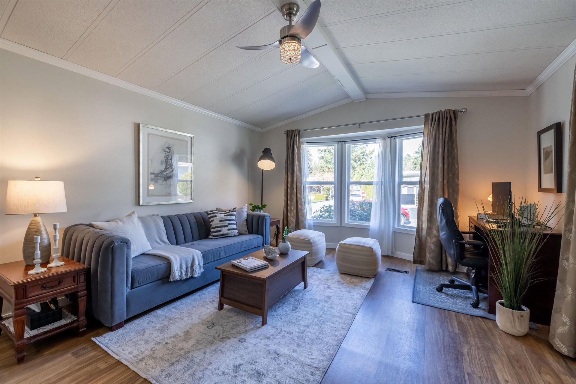 Welcome to DEER CREEK ESTATES, a desirable adult-oriented community surrounded by nature. This completely renovated 2 bed, 2 bath offers 936sqft of bright living space with vaulted ceilings & large windows that bring in natural light. Updates from top to bottom include NEW gyprock walls & exterior siding with new vinyl floors throughout, along with all new bathroom fixtures & equipped w/ AC. The renovated kitchen includes custom built-ins for storage, ample counter space, and a separate dining area perfect for entertaining. The spacious primary suite includes a large closet and a private en-suite. There’s convenience of a parking pad plus covered parking, a connected WORKSHOP, private patio, and an additional shed for extra storage options. Move-in ready & ideal for downsizers!