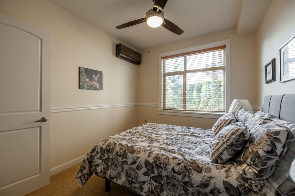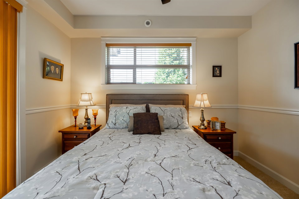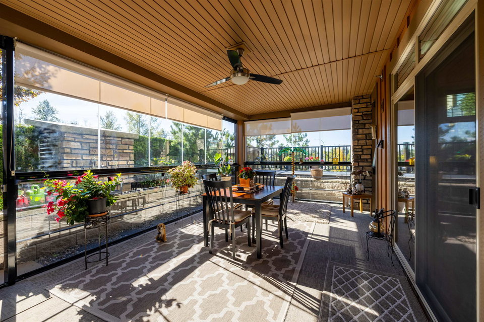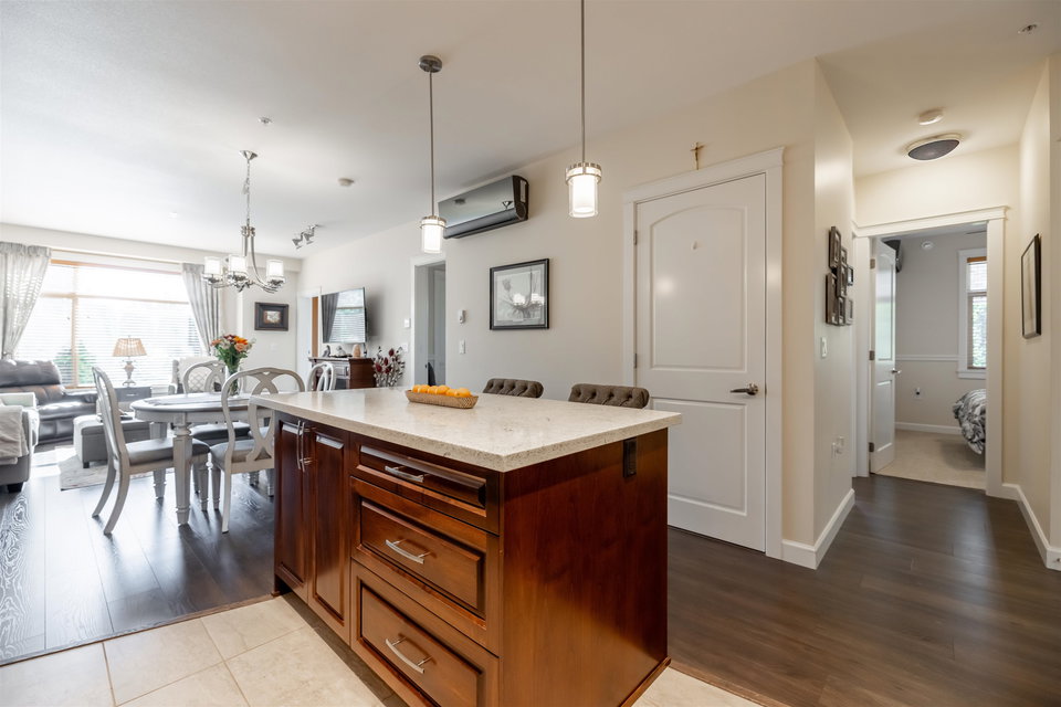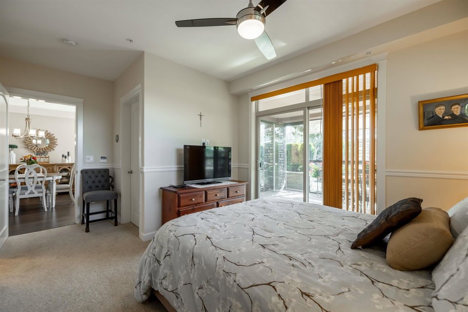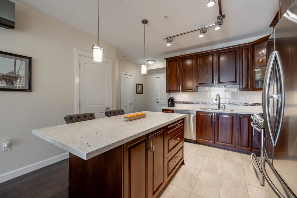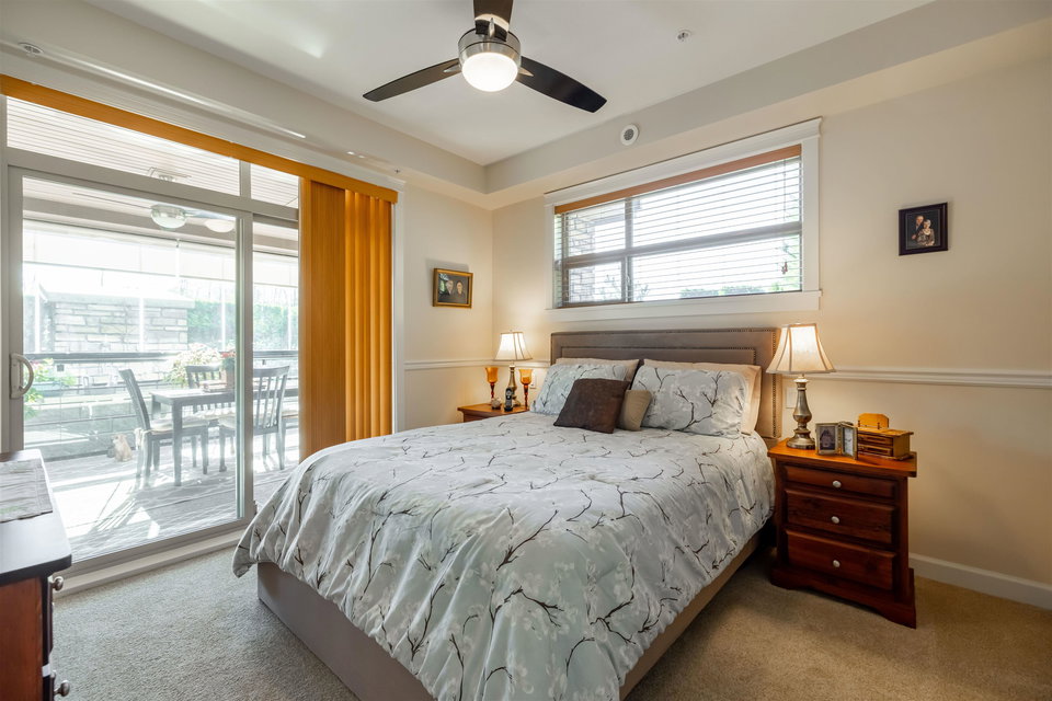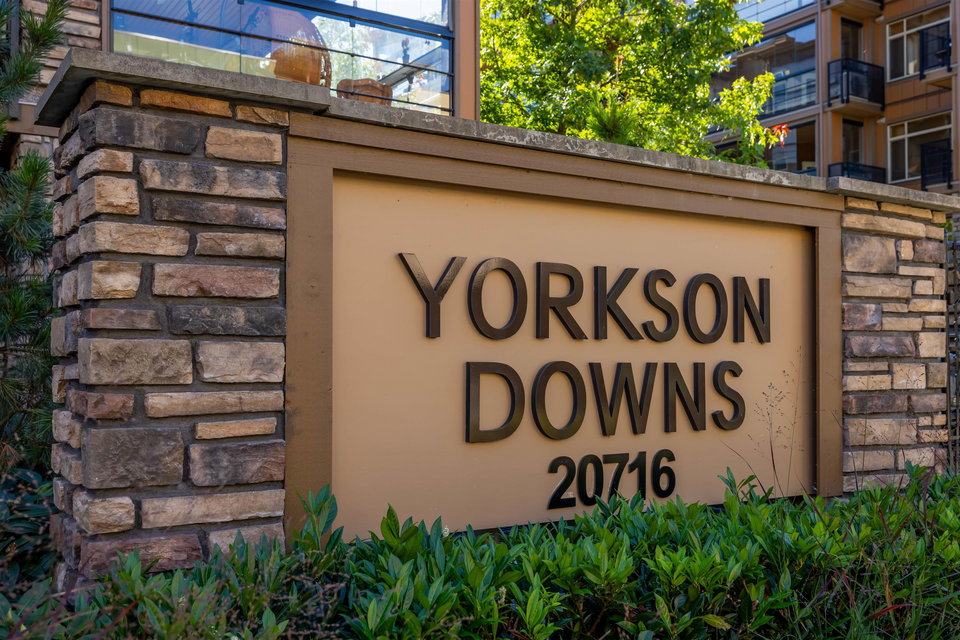 Incredible 3 bedroom garden condo in Yorkson Downs! Located on the SouthWest corner this ground floor condo offers a bright open layout in spotess condition. Loads of natural light in the best spot in building. Large living room w space for your large dining table. Beautiful kitchen w cherry cabinets, quartz counters, stainless appliances, & island to entertain. Great master suite w walk in closet & 4 pc ensuite. 2 other rooms great for office & guests. Fantastic 251 sq ft solarium patio w/ retractable glass panels, gas BBQ hookup, & access to your own gardens! Ultra PRIVATE location. 2 secured underground parking stalls w large storage space in front of your cars & plug in for electric car. Footsteps to restaurants, shopping, Elementary school, parks & more! Call today for your tour!