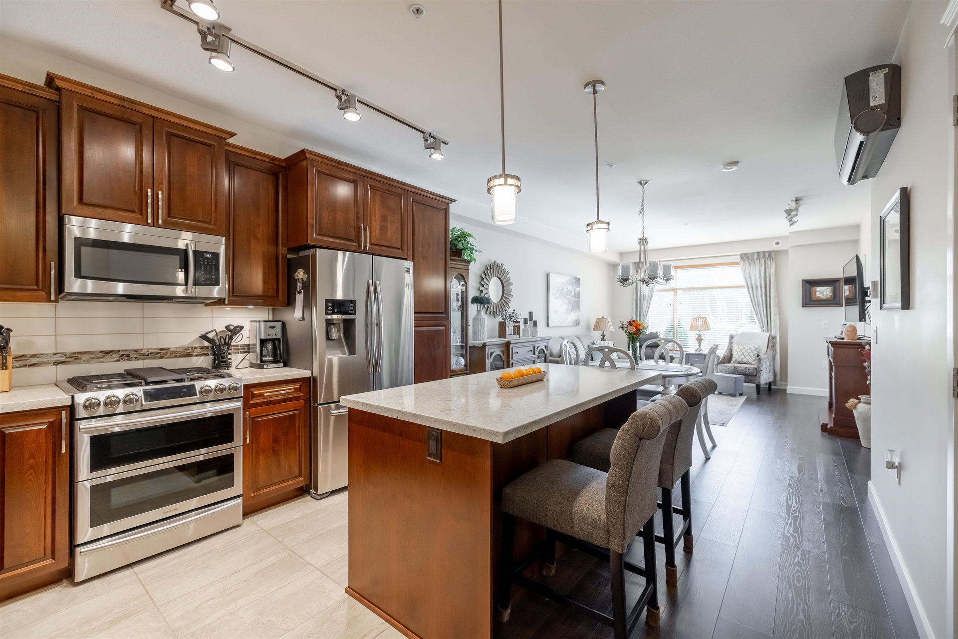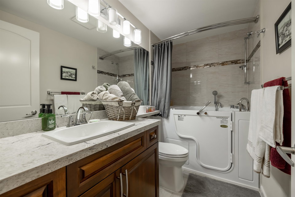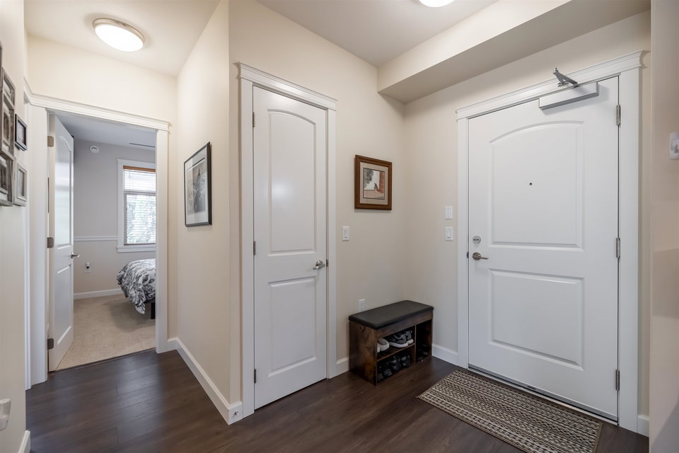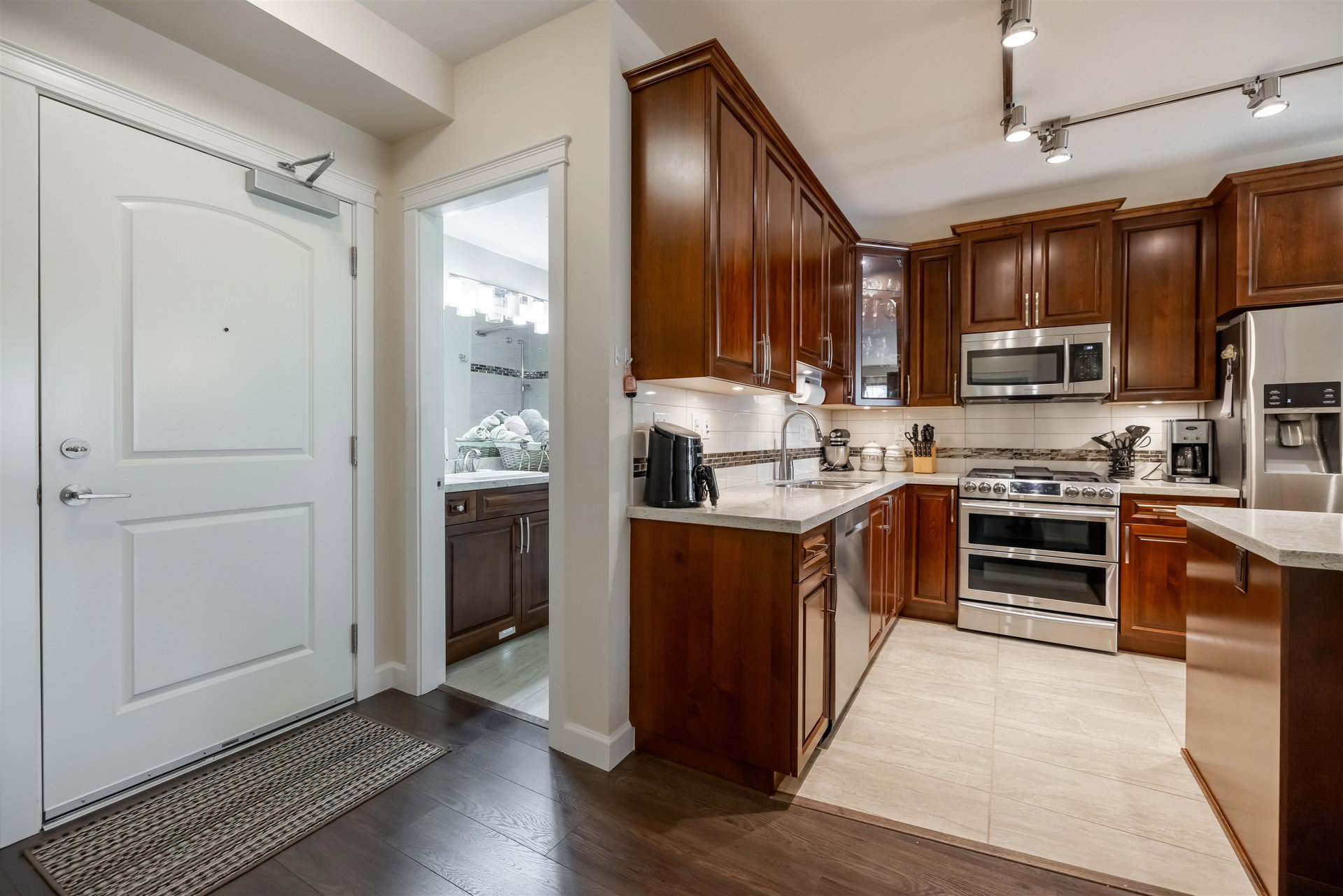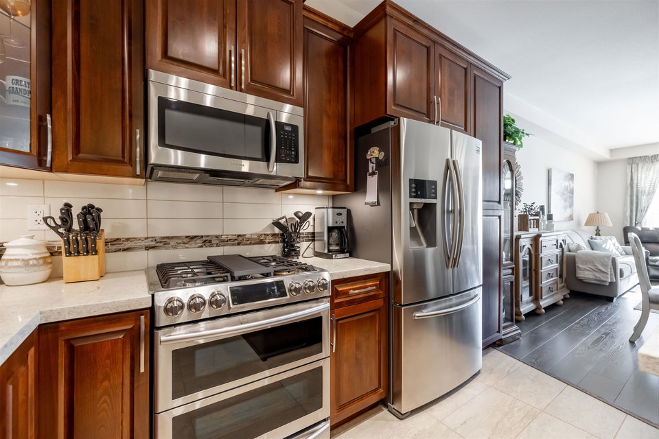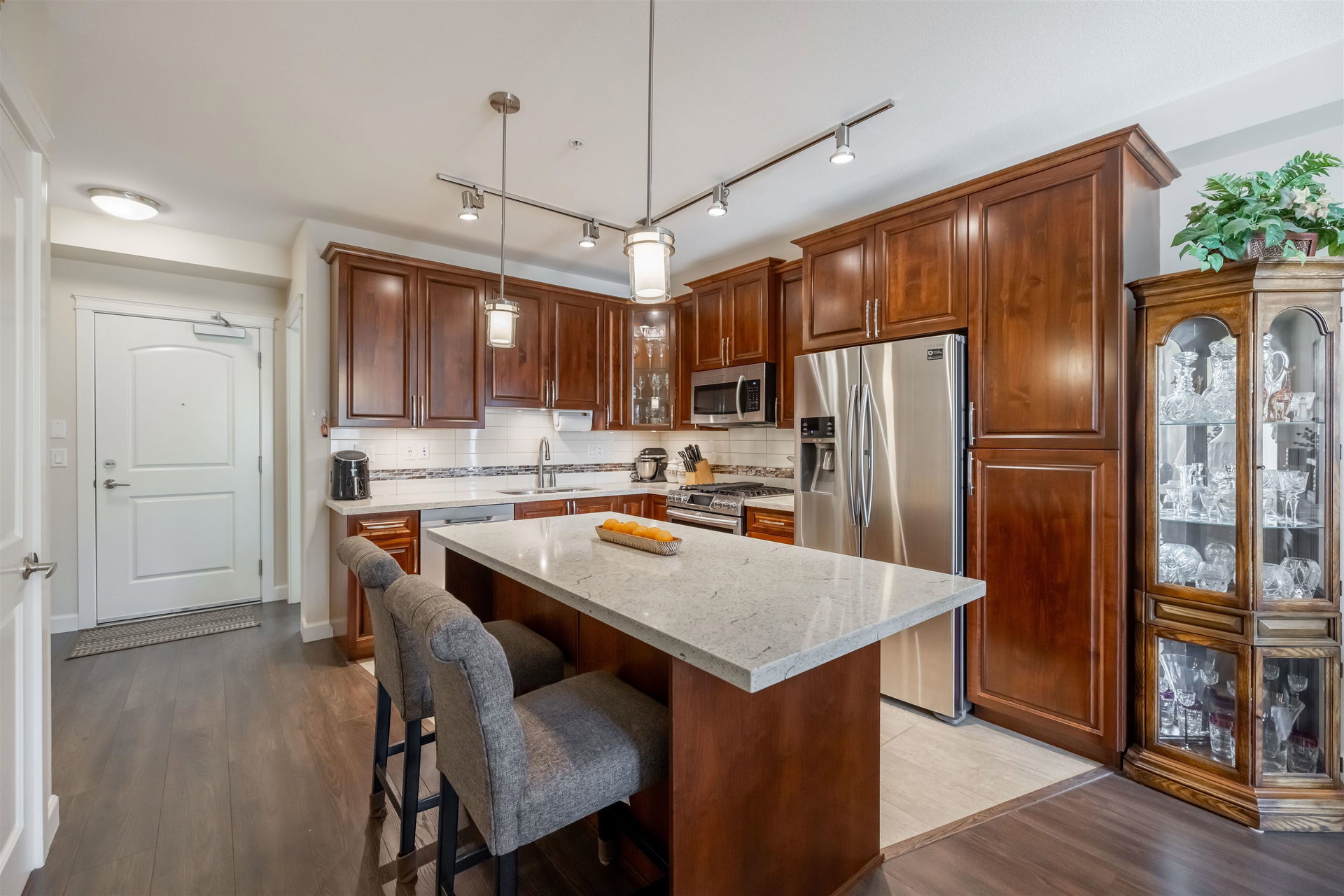 Incredible 3 bedroom garden condo in Yorkson Downs! Located on the SouthWest corner this ground floor condo offers a bright open layout in spotess condition. Loads of natural light in the best spot in building. Large living room w space for your large dining table. Beautiful kitchen w cherry cabinets, quartz counters, stainless appliances, & island to entertain. Great master suite w walk in closet & 4 pc ensuite. 2 other rooms great for office & guests. Fantastic 251 sq ft solarium patio w/ retractable glass panels, gas BBQ hookup, & access to your own gardens! Ultra PRIVATE location. 2 secured underground parking stalls w large storage space in front of your cars & plug in for electric car. Footsteps to restaurants, shopping, Elementary school, parks & more! Call today for your tour!