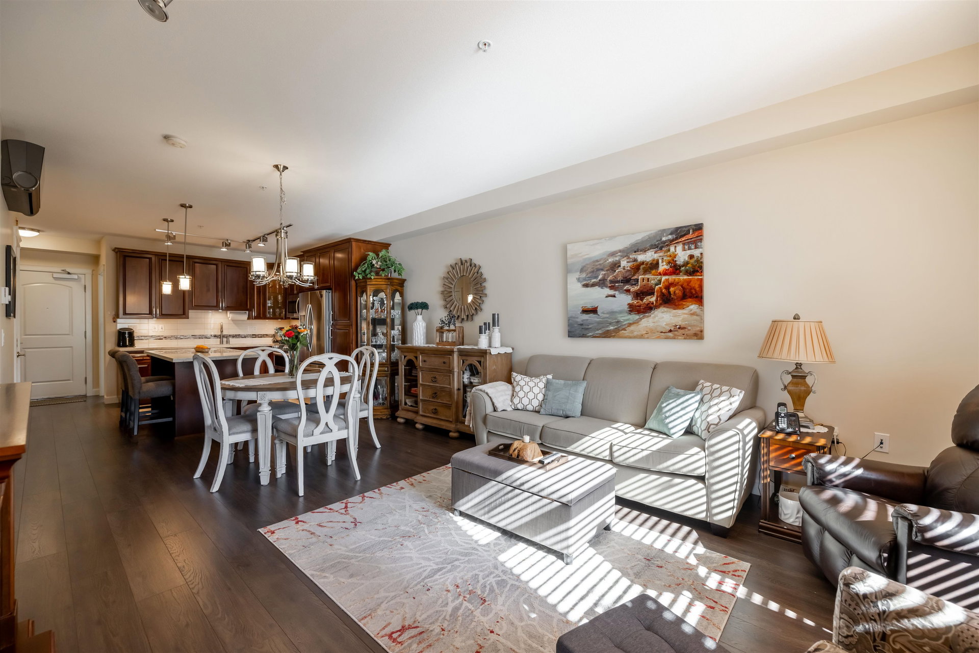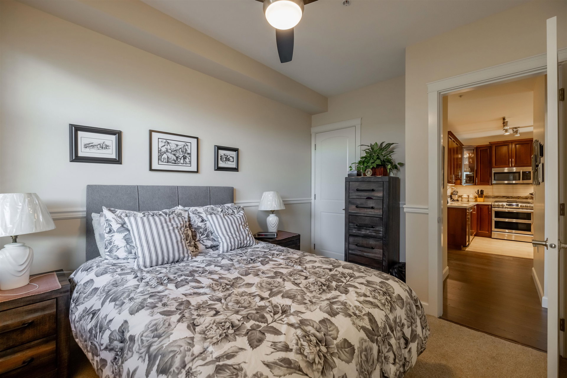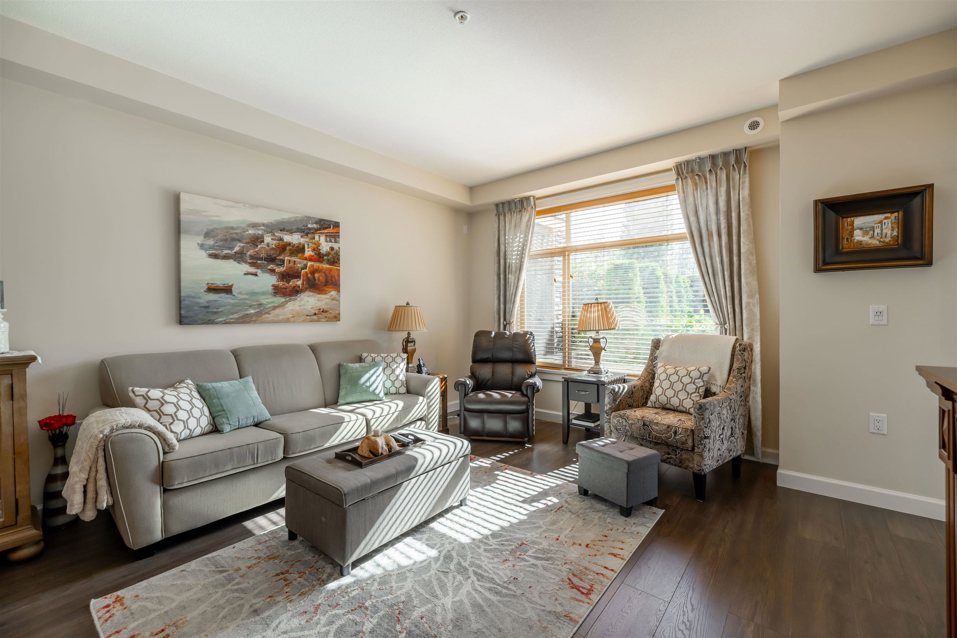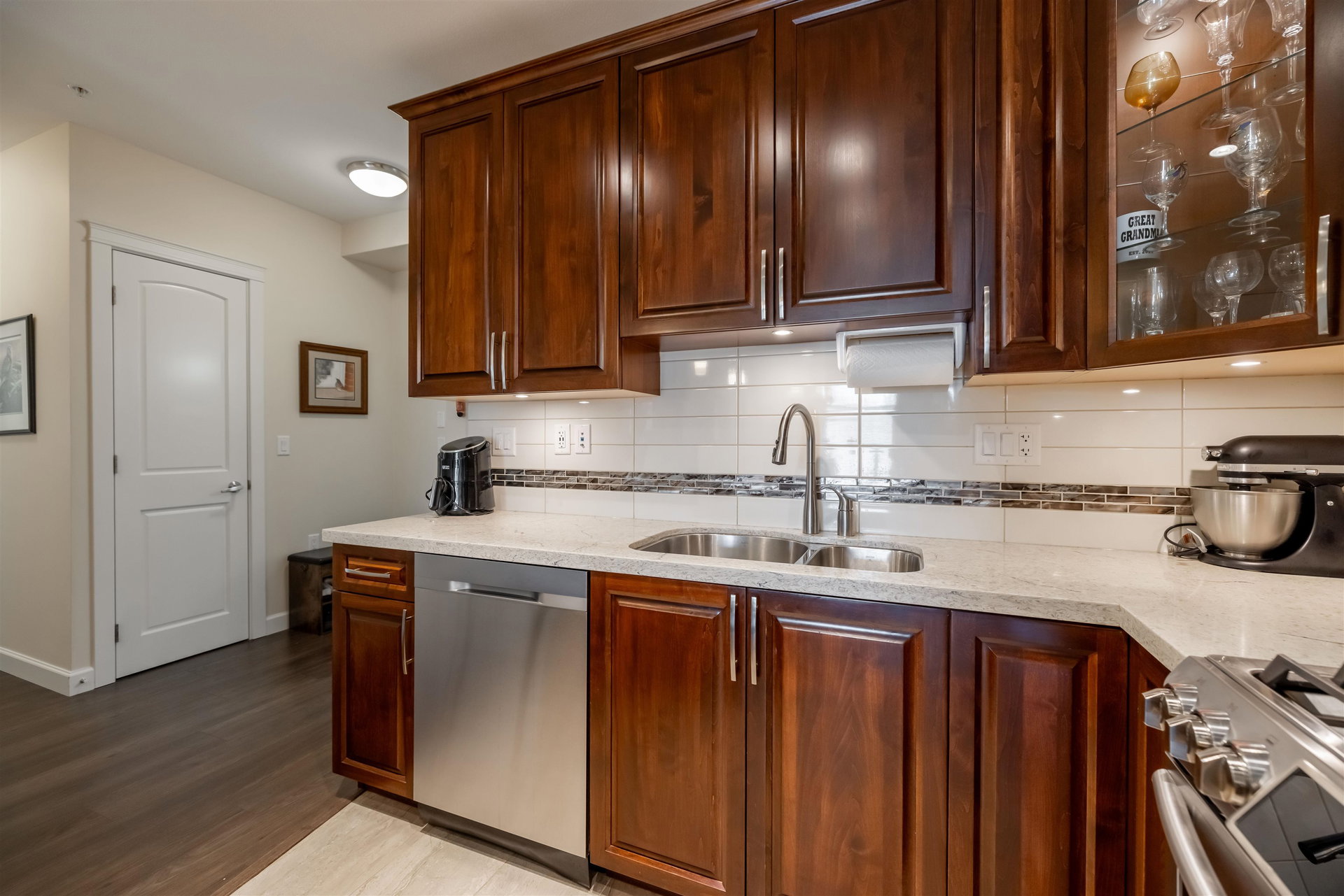 Incredible 3 bedroom garden condo in Yorkson Downs! Located on the SouthWest corner this ground floor condo offers a bright open layout in spotess condition. Loads of natural light in the best spot in building. Large living room w space for your large dining table. Beautiful kitchen w cherry cabinets, quartz counters, stainless appliances, & island to entertain. Great master suite w walk in closet & 4 pc ensuite. 2 other rooms great for office & guests. Fantastic 251 sq ft solarium patio w/ retractable glass panels, gas BBQ hookup, & access to your own gardens! Ultra PRIVATE location. 2 secured underground parking stalls w large storage space in front of your cars & plug in for electric car. Footsteps to restaurants, shopping, Elementary school, parks & more! Call today for your tour!