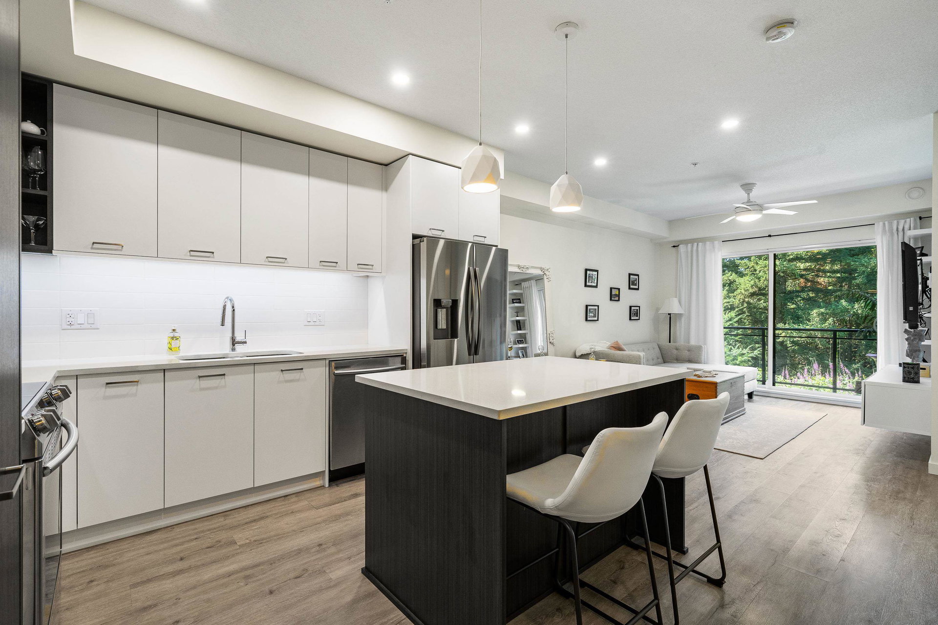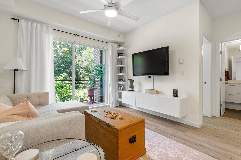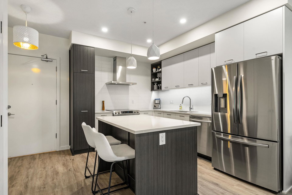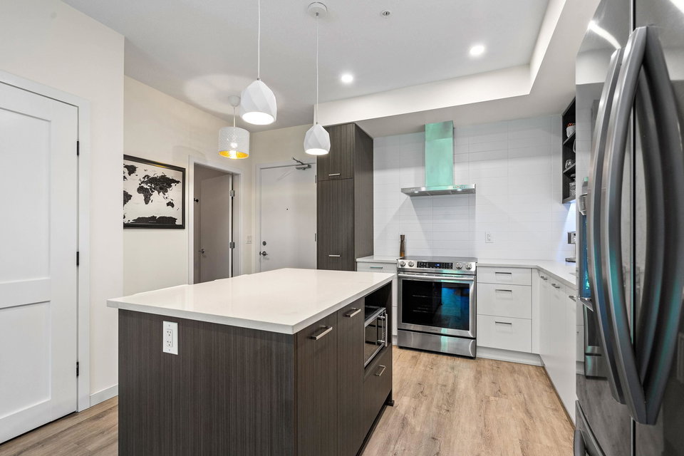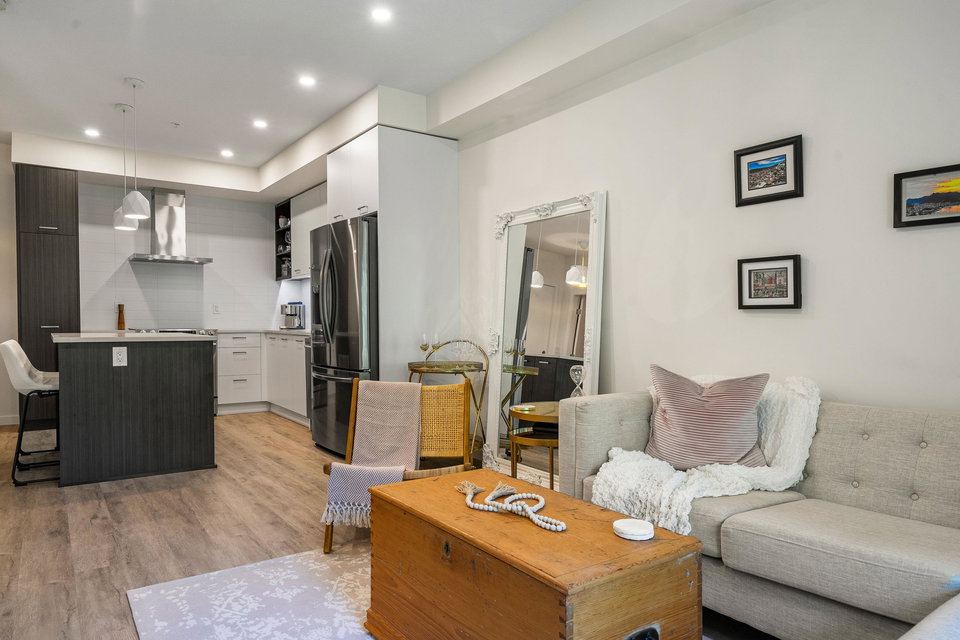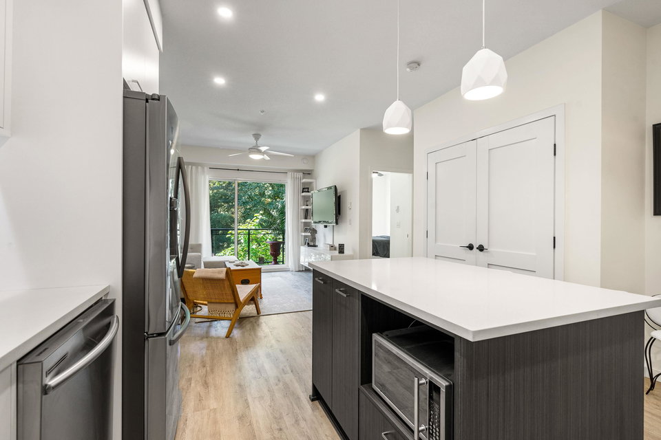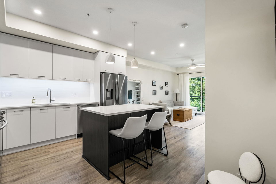 Welcome to your dream home at Park Hill in Willoughby Heights! This stunning 680-square-foot unit features 1 bedroom and a versatile den. The open-concept living area includes a massive kitchen with high-end appliances and ample cabinetry. The spacious living room flows into a private balcony overlooking a lush greenbelt, offering extreme privacy. The primary bedroom is a serene retreat with a large closet and picturesque views. The versatile den can be used as an office, guest room, or reading nook. Enjoy in-suite laundry, high ceilings, secure parking, and storage.Located near shopping, dining, parks, top-rated schools, and public transit, this pet-friendly building offers convenience and comfort. Make this exceptional property your new home today!